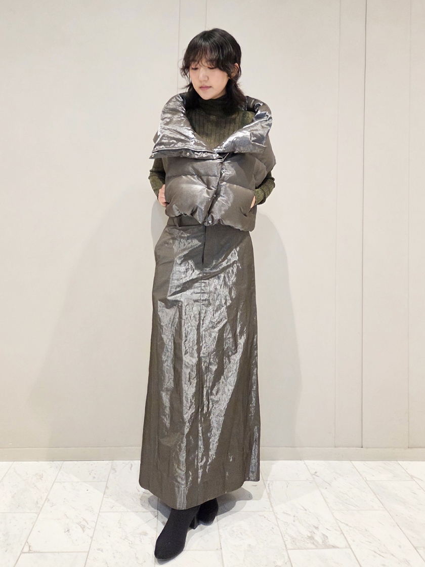 カジュアルな印象のアイテムを、シャイニーな素材とシルクの上質さ、ミニマルなデザインでエレガントに昇華しました。 同素材のスカートとのセットアップスタイルは、軽やかさと華やかさを両立。冬の装いに新鮮なモード感を添えます。