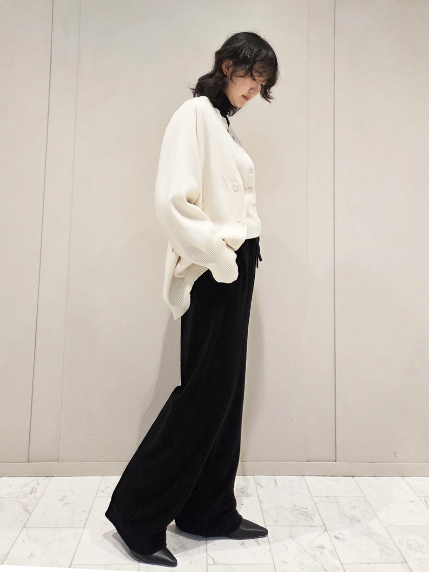 ハンドメイドならではのクラフト感が魅力のボレロを主役に、人気のワイドパンツをスタイリング。上質なぬくもりを感じるボレロは、袖口にシャーリングゴムを編み込むことでタックアップしやすく、ショールのように気軽にご着用いただけます。構築的なパンツのシルエットが全体を引き締め、「オーヴィル」らしい洗練されたバランスに。