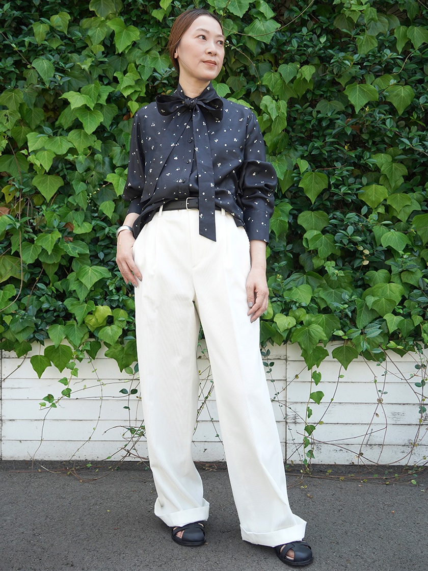 ヴィンテージライクな小花柄が効いたシルクシャツを主役に。取り外し可能なボウタイは、大きめのリボン結びできっちりしさせ過ぎず、大人の余裕をプラスするのが気分。デイリーユースには、さりげなくワークディテールの効いたコーデュロイパンツでカジュアルダウンするのがグッド。ボトムスを選ばない短め丈のブラウスは、前だけ軽くインしてレザーベルトでコーデを引き締めるとぐっと今年らしく着こなせます。