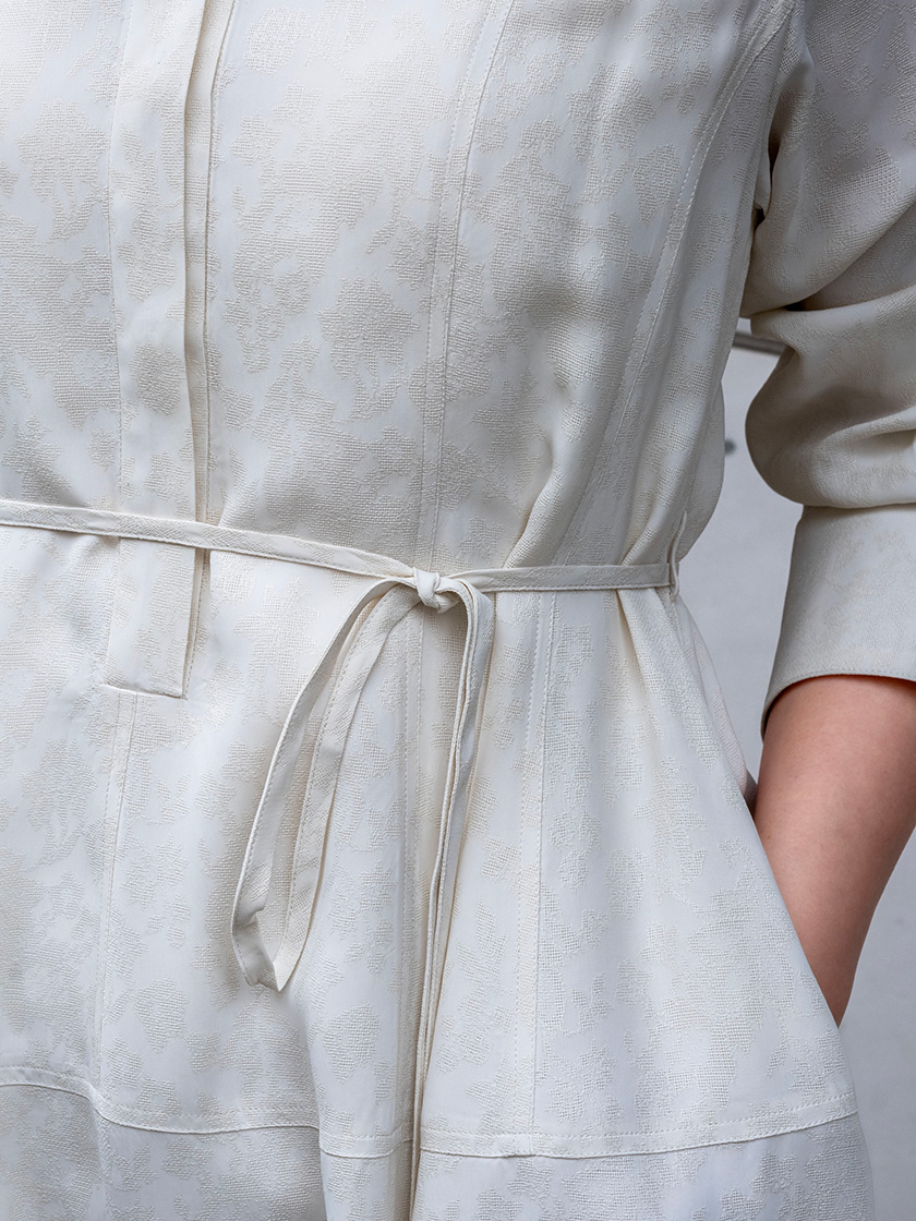 清楚な着こなしの中にもファッションスパイスをひとさじ。ELLE SHOPに入荷したばかりの花柄のジャカードワンピースなら、繊細で立体感のある表情と流れるようなドレープが美しい佇まいを演出します。バンドカラーにバレル型のスカートシルエットが新鮮! 肩~ヒップの切り替えステッチなど細部まで「エブール」らしいこだわりを詰め込みました。袖を少しだけたくし上げて、小物で差し色を入れるのが抜け感を醸すコツ。