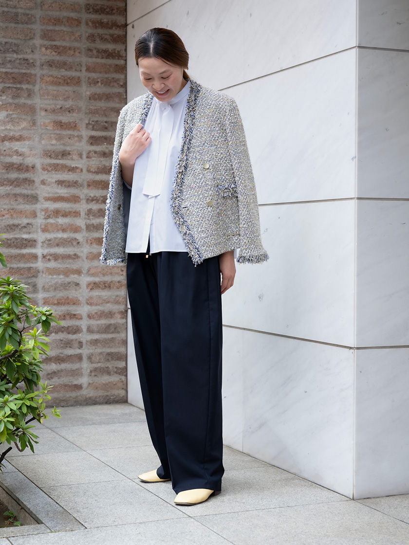 上質な素材が引き立つシンプルコーデに華やかなダブルブレストジャケットを一点投入しました。素材はイタリアの老舗メーカー・LINTON社のドビー織り生地をセレクト。品の良いボウタイブラウスに軽く羽織るだけでこなれ感が漂います。ノーカラーだからこそ引き立つ襟まわりとポケットのフリンジテープ使いにうっとり。