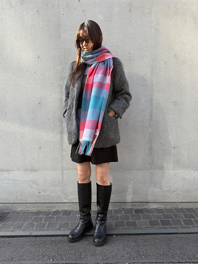 白度の高いカシミヤだからこそ表現できる澄んだ発色が、グレーアウターの落ち着いたトーンに優しく映え、顔まわりにふわりと華やぎを添えます。軽やかなミニサイズは、巻いても垂らしてもバランスが美しい仕上がり。さらにカシミヤ100%でアンダー3万円なのもポイント。モノトーンの日こそ取り入れたい、冬の“彩りアクセント”に!