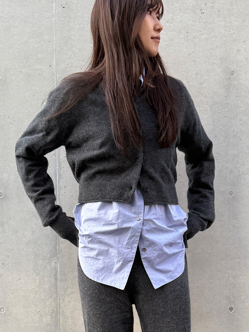 軽やかなシアー感と、とろけるような肌触りを持つカーディガンとパンツのセットアップは、カシミヤの“静かなラグジュアリー”が最も美しく際立つ組み合わせです。動きに合わせて柔らかく揺れるニットが、シルエットだけで洗練を生み、上品でリラックス感のある冬スタイルを叶えます。