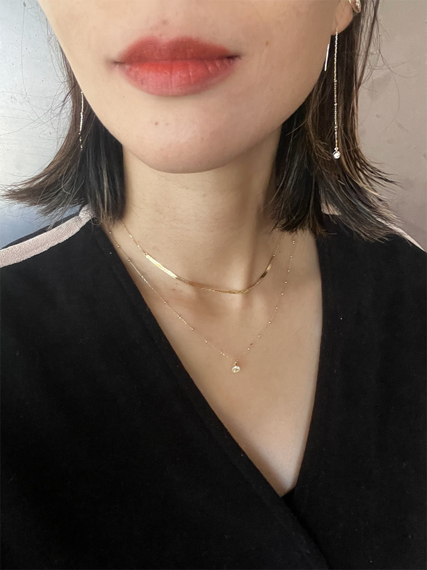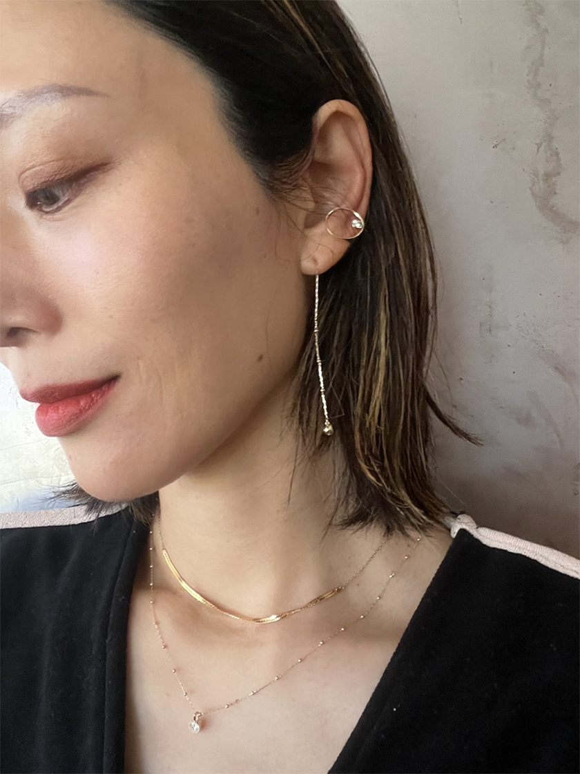 一粒ダイヤのネックレスは、レイヤードすることで定番の佇まいにモードなニュアンスをプラス。ピアスは長さを自在に調整できるアメリカンタイプで、左右アシンメトリーのコーディネートに仕上げるのもおすすめです。