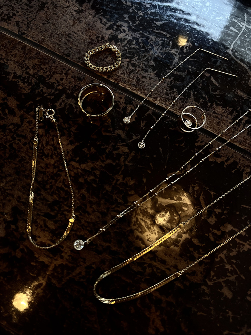 シンプルすぎず、盛りすぎず、ゴールドとダイヤモンドの上品な輝きが主役となり、デイリーから特別なシーンまで溶け込むスタイリングを意識しました。