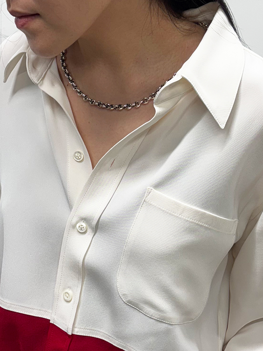 クリーンな襟付きシャツから覗かせるシルバー925の輝きがモダンで上品な印象へ。“20inch 5mm OPEN-LINKネックレス”は鎖骨下ほどの長さでどんなコーディネートとも相性抜群。クラシックなデザインは、年齢や性別を問わず楽しめます。