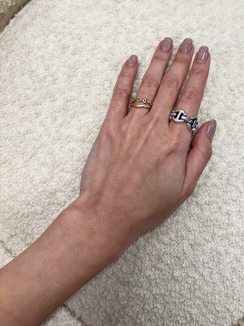 「ホーセンブース」定番の“TRI-LINK/トライリンク”モチーフのリングを素材MIXでコーディネート。大ぶりの“DAME CLASSIC TRI-LINKリング”は人差し指に着用して思い切り目立たせて。細身の“MICRO DAME Ⅱ TRI-LINKリング”は、マリッジリングとレイヤード。品の良さの中にエッジを効かせたレイヤードが「ホーセンブース」らしさを引き立てます。