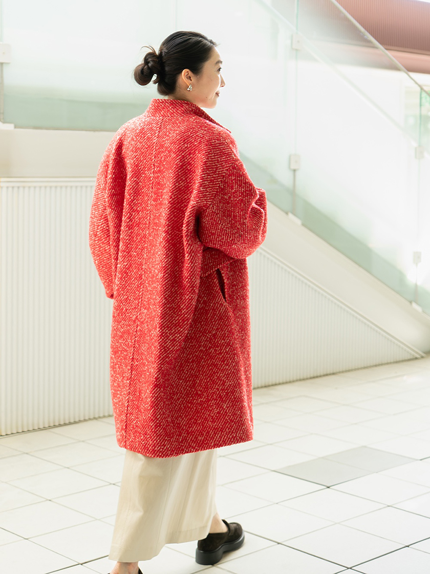 太番手のループ形状の糸で霜降り調に織りあげ、温かみがありながらも軽やかな仕上がりのチェスターコート。鮮やかなカラーリングは「ハウス オブ ロータス」オリジナルで出してもらった別注カラーです。ゆったりとしたアームホールは抜け感のあるシルエットで中にニットを着てももたつきません。コートインにはターコイズをしのばせてみました。