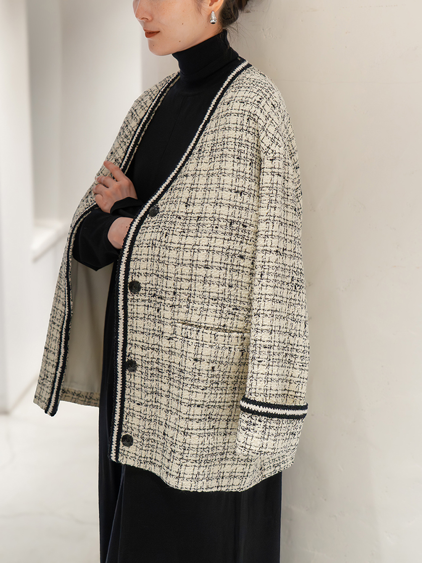 マイ・スタンダードなモノトーンスタイル。羽織るだけでグッと華やぐツイードジャケットはアウターとしても使える優れもの。リラックス感のあるニットアップをラグジュアリーに格上げしてくれます。展示会から早々に狙っていたニットアップは簡単にコーディネートが決まるところがお気に入り。今シーズンの一軍アイテムです。