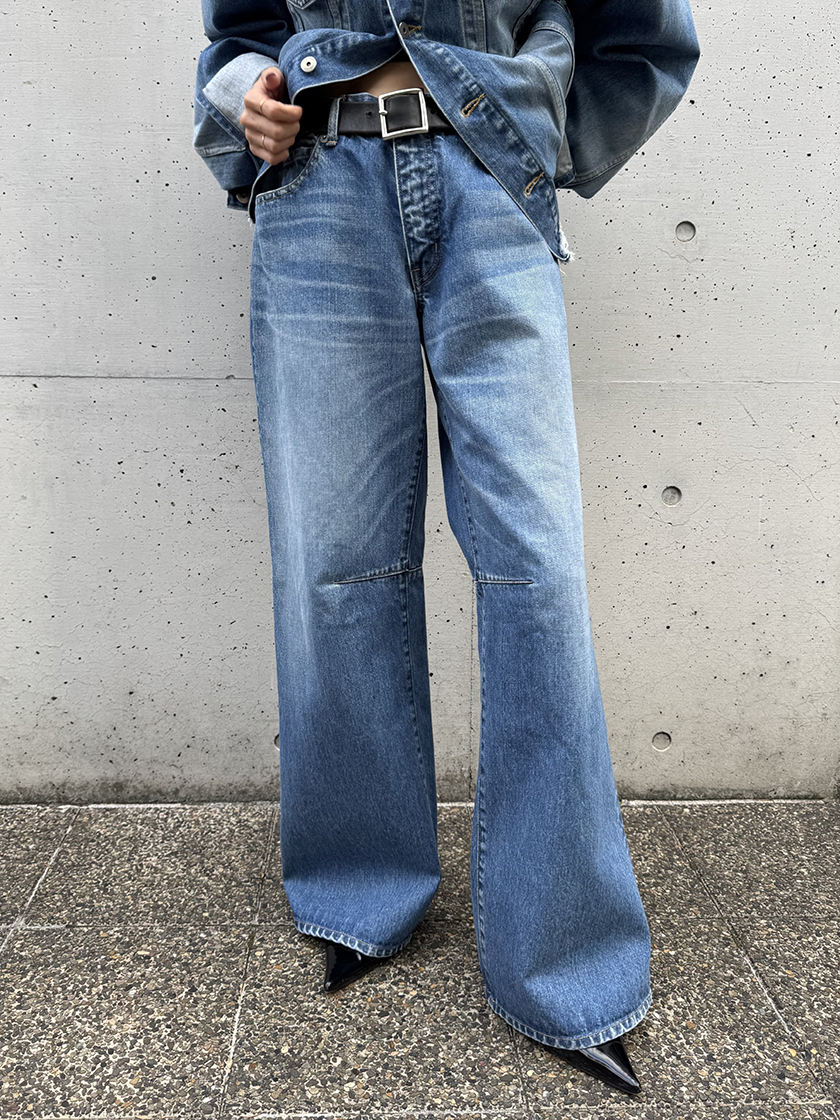 デニムジャケットはオーバーサイズシルエットですが、裾の切りっぱなしデザインで丈を短くしており、女性でもバランスが取りやすい一着。たっぷりとしたサイズ感なので、袖をめくることで抜け感を加えつつ、スマートな印象に着こなせます。合わせたのは、同素材のルーズフレアデニムパンツ。股上が少しだけ浅めなのですが、ヒップまわりやももまわりにはゆとりがあるので、大人の方でも履きやすいデザイン。長めのパンツ丈と程よいフレアシルエットで、一気に今年顔になれるいちおしのデニムです。どちらもUSED加工を施しており、ブランドらしさが光るアイテムです。