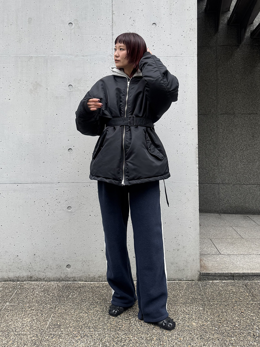 発売するたびに人気のトラックパンツを、今季はフリース素材にアップデート。軽く滑らかな素材感で履き心地が良く、ウエストにはドローストリングがついているので、ストレスフリーに着用できます。カジュアルなアイテムなので、ヒールを合わせ大人な印象のスタイリングに仕上げてみました。