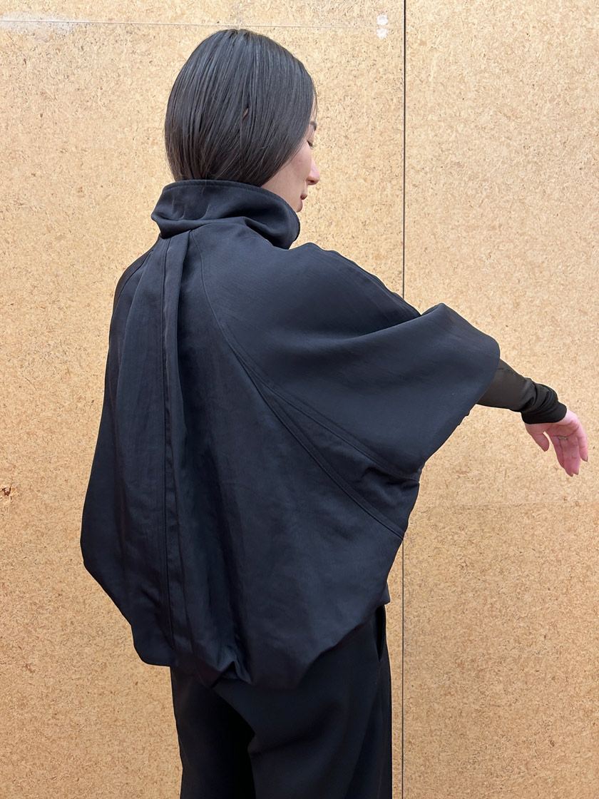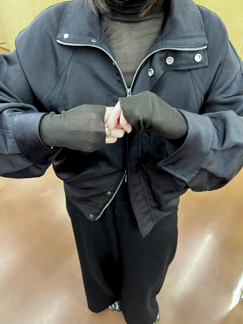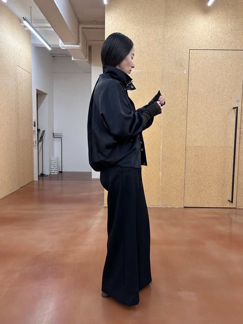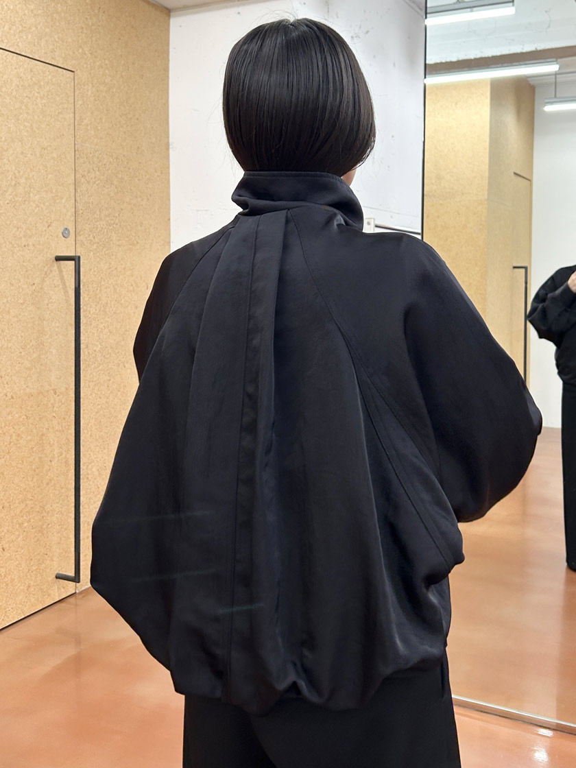 後ろ身頃のボリュームあるタックギャザーが印象的な定番のボンバージャケットは、立体的なシルエットが動くたびにふわりと広がり、どこから見てもこなれた存在感を出すことができます。素材は表情が豊かな艶感のあるナイロンで、デイリーに使いやすいイージーケア素材だけど、カジュアルになりすぎないので幅広いシーンで着用できます。