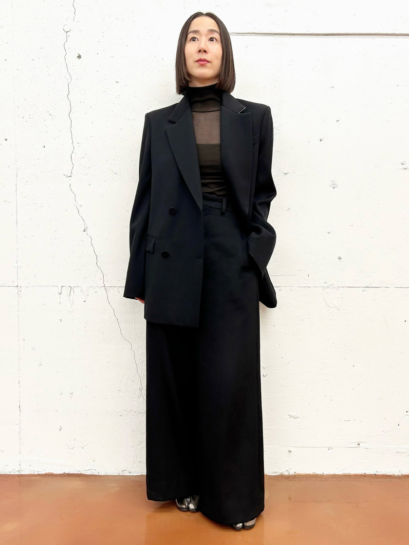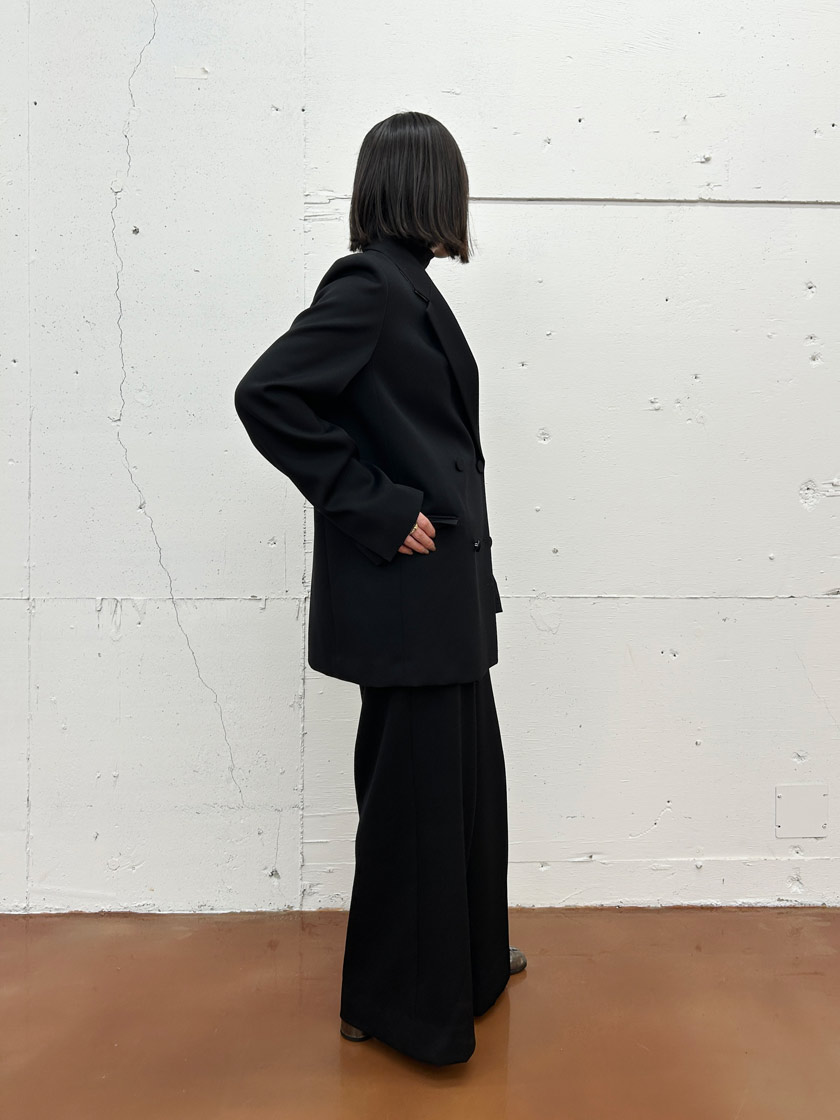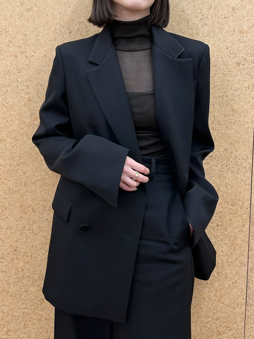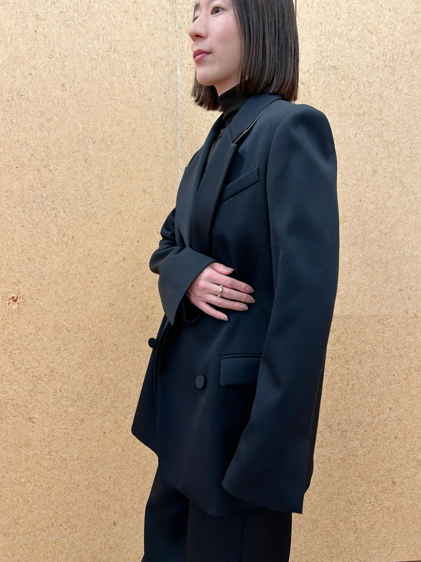 この定番ジャケットは一着持っているとすごく便利! シャープな肩のラインとヒップが隠れる少し長めの着丈がハンサムなシルエットで、羽織るだけで雰囲気が決まります。尾州産のSUPER120Sウールの上質な生地は、絶妙な光沢とハリがあり、上品でしなやかな印象を与えてくれます。セットアップでクリーンにまとめても、デニムでラフにしても、バランスよくまとまります。季節や時代を問わず長く愛用できるのも魅力です。
