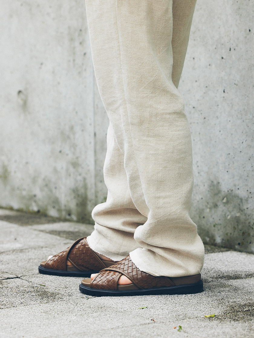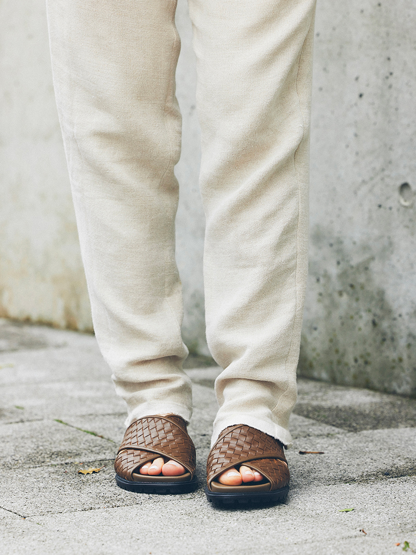イントレチャートのクロスデザインサンダルはELLE SHOP限定モデル。足元にラグジュアリーな空気をプラスし、マニッシュなシャツやジャケットスタイルからサマーワンピースにさらっと合わせても◎。コーディネートになじみつつ存在感の出る足元を演出。