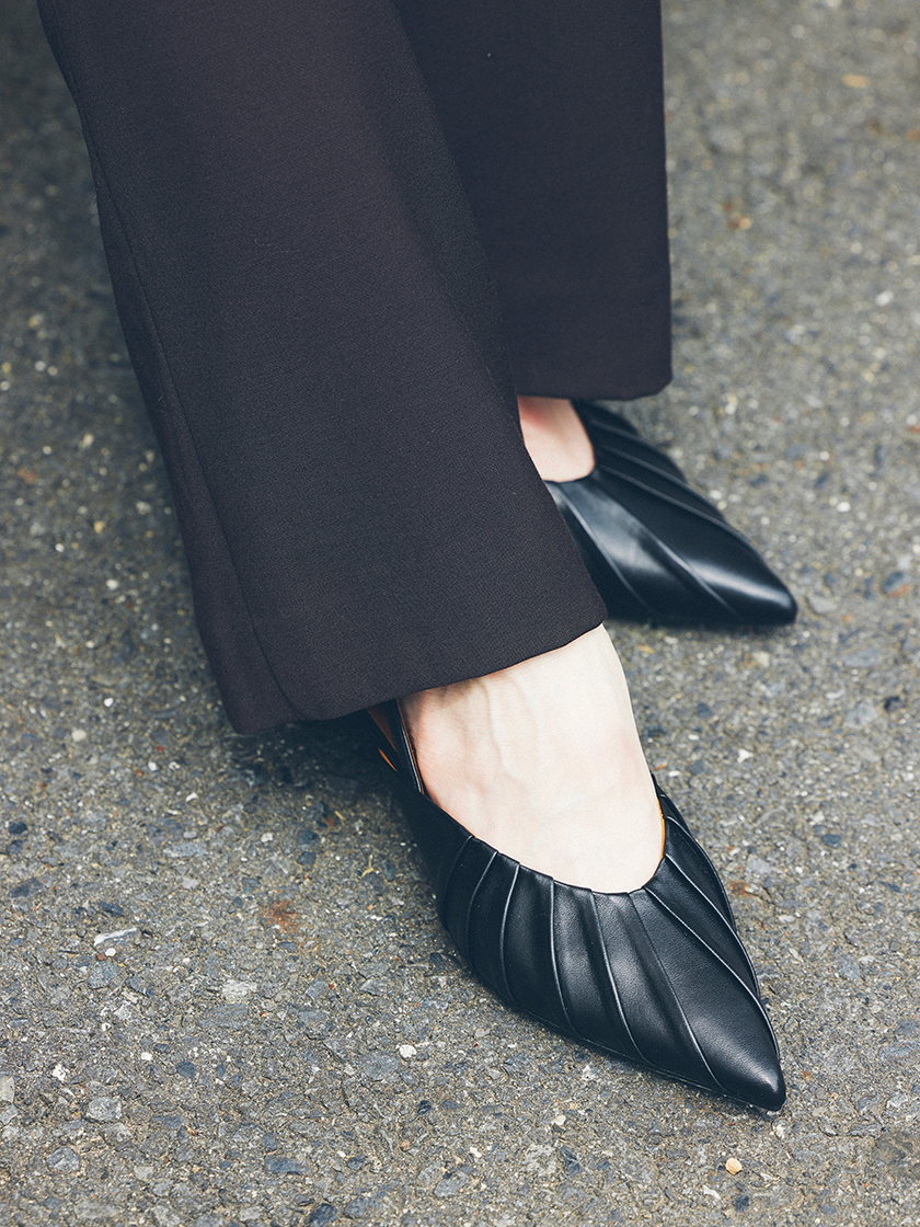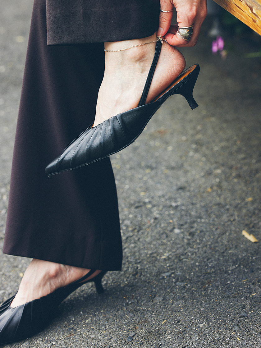 バックストラップのパンプス“Fleur”はタックデザインがポイントのソフトな履き心地が魅力。素足で履いた際に足の甲がきれいに見え、ソックスやタイツを合わせたスタイルなど多様に楽しんでいただけます。疲れにくい4.5cmヒールで立ち仕事やフォーマルなシーンでも活躍するアイテム。