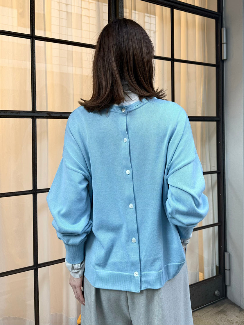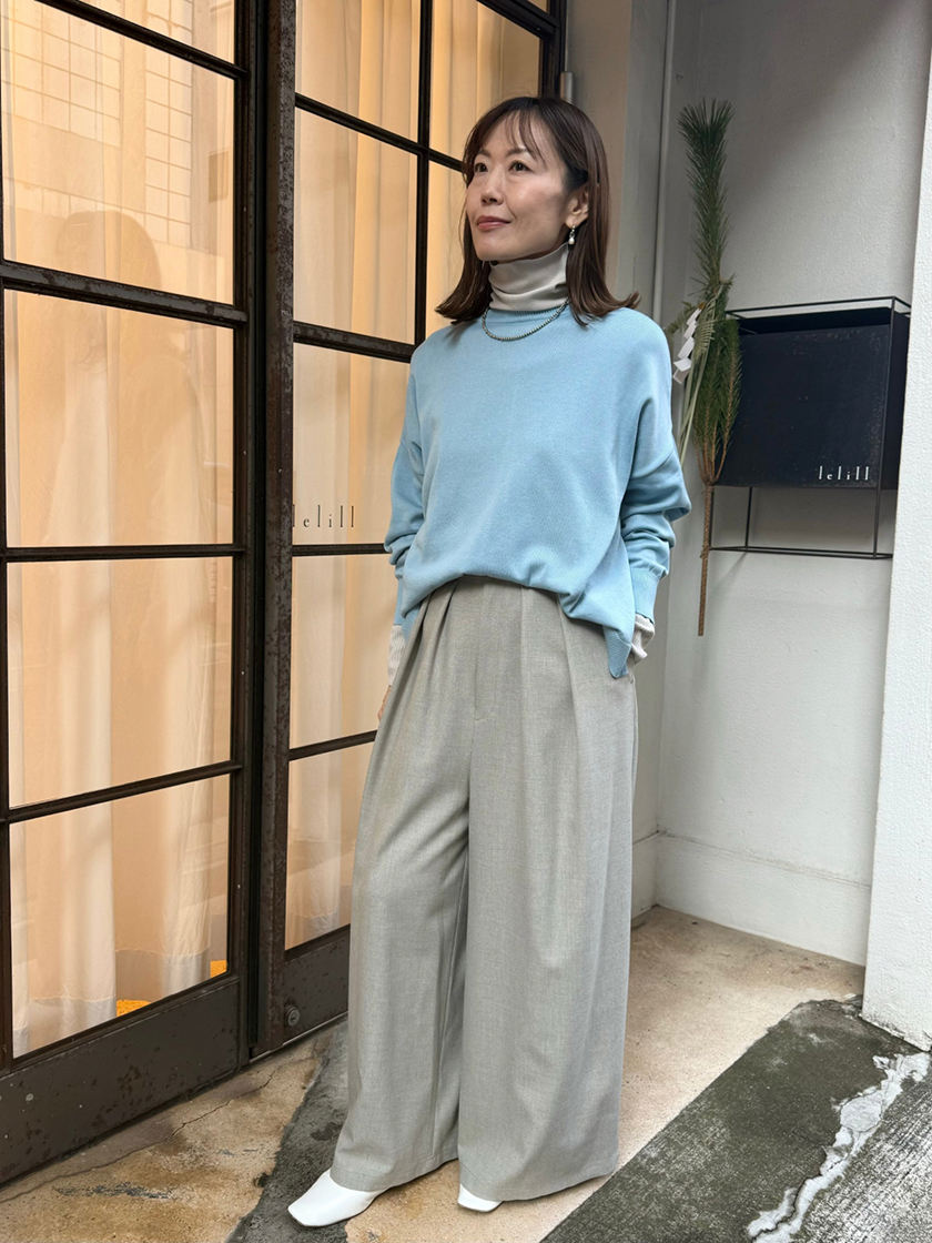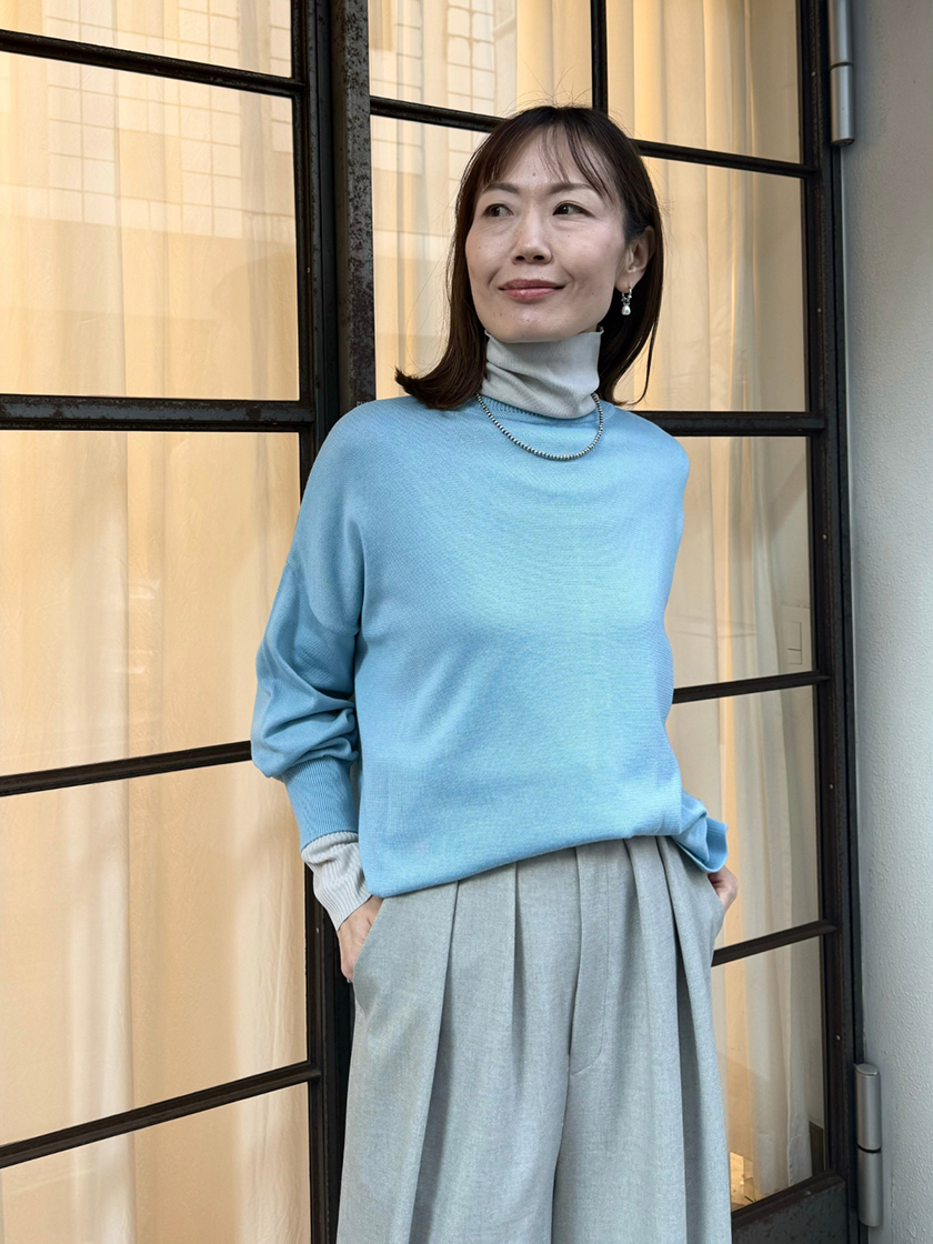ハイテク2wayカーデのブルーは淡い爽やかな色味なので、インナーとボトムにも淡い色を合わせました。
