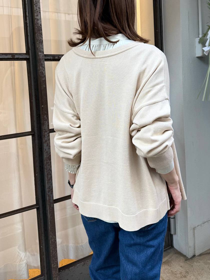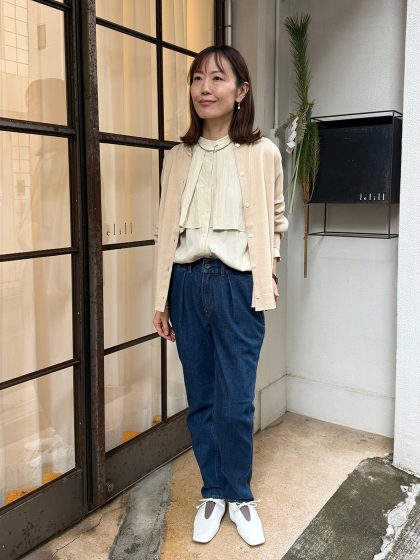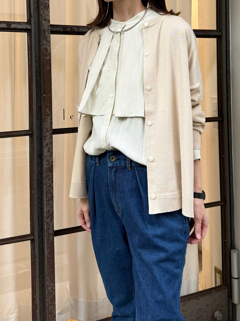 ハイテク2wayカーデのベージュは落ち着いた色味ながら春を感じさせる柔らかい色なので、中に同色の2wayフラップブラウスと合わせて軽やかにしました。