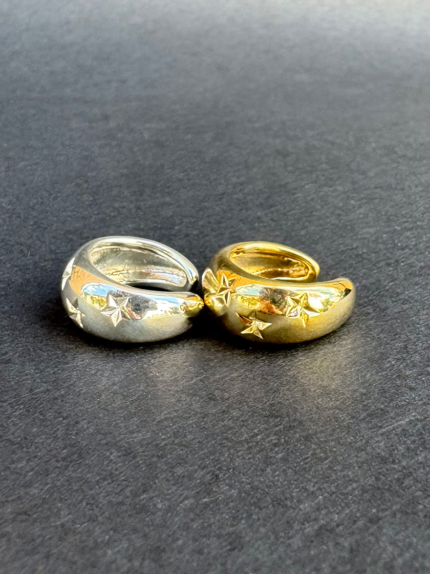 存在感あるフォルムと繊細な星の模様が印象的なイヤーカフ。ボリューム感のあるデザインが力強さとクールな印象を与え、片耳だけに着けるアシンメトリーなスタイルがモード感を引き立てます。パールネックレスとのミックスアンドマッチで、より感度の高いスタイリングに。