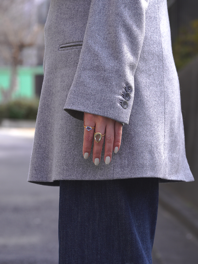 耳元はソリッドなシルバーのフープピアスで、少しモードなエッセンスを。首もとは2連付けにして華やかさを出しつつ、ブラックスピネルとグレーパールでダークトーンにまとめました。華美になりすぎず、女性らしい静かなムードを楽しめる組み合わせです。