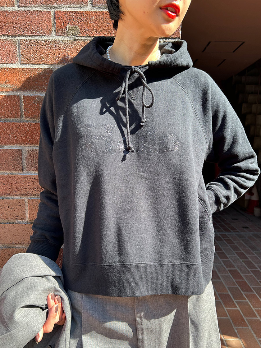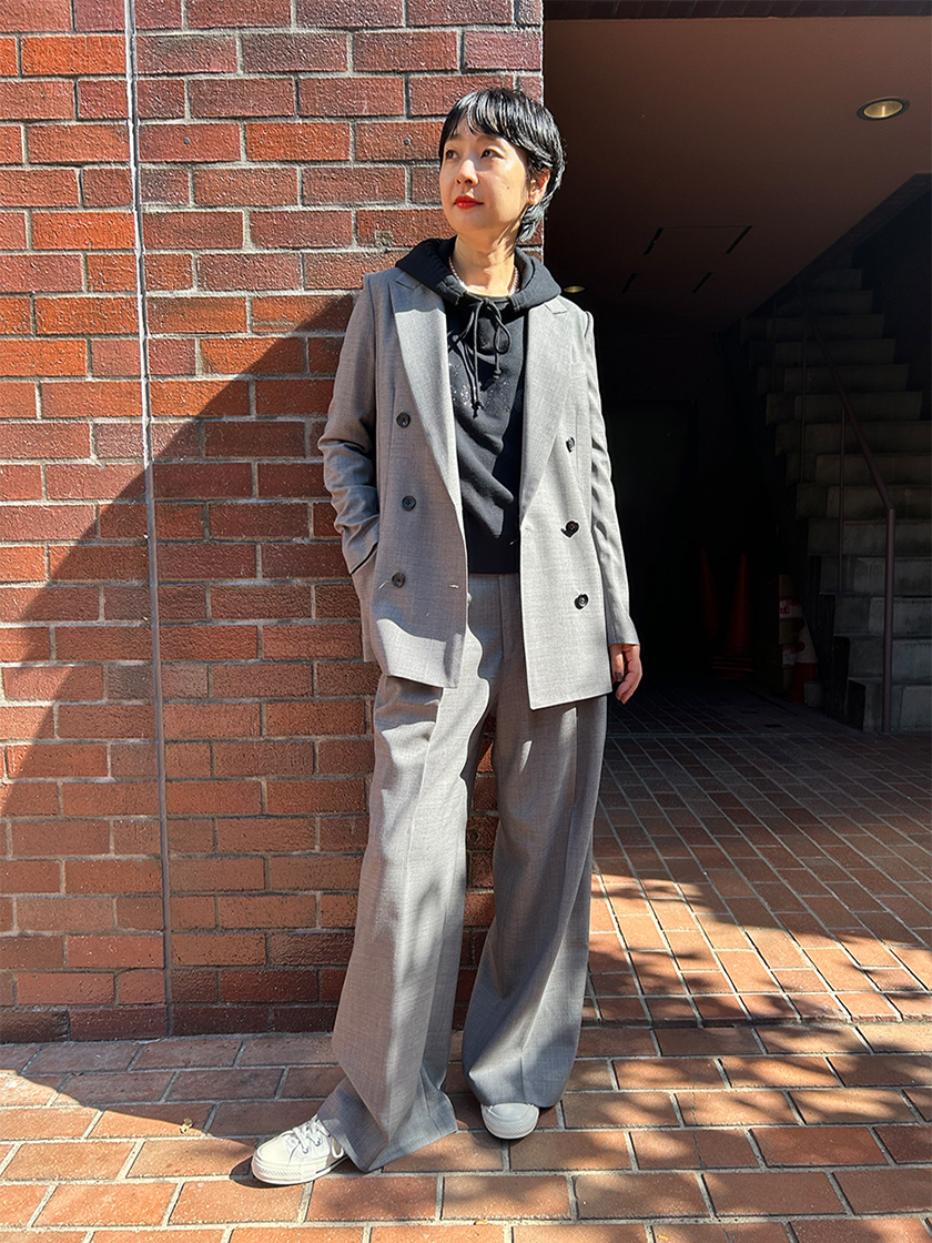 マニッシュ×リラックスのMIXスタイル。季節が少しずつ深まり、街にコートの気配が漂いはじめる頃。軽さと上質さを兼ね備えたウールトロのセットアップは、そんな移りゆく季節にちょうどいい存在。マニッシュなグレートーンに、ややリラックスしたワイドシルエットが今のムードを感じさせます。胸元の“HELLO”ロゴがグリッターで輝くパーカーを差し込むことで、ほどよい遊び心をプラス。上品さと抜け感のバランスが絶妙で、トラッドでもストリートでもない大人の余白を感じる着こなしに。