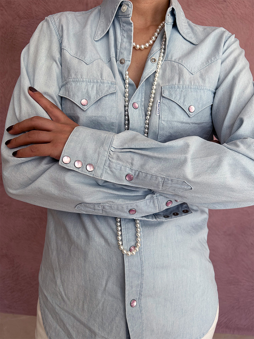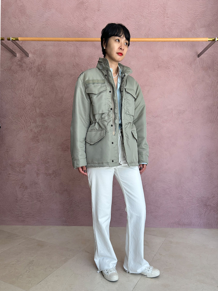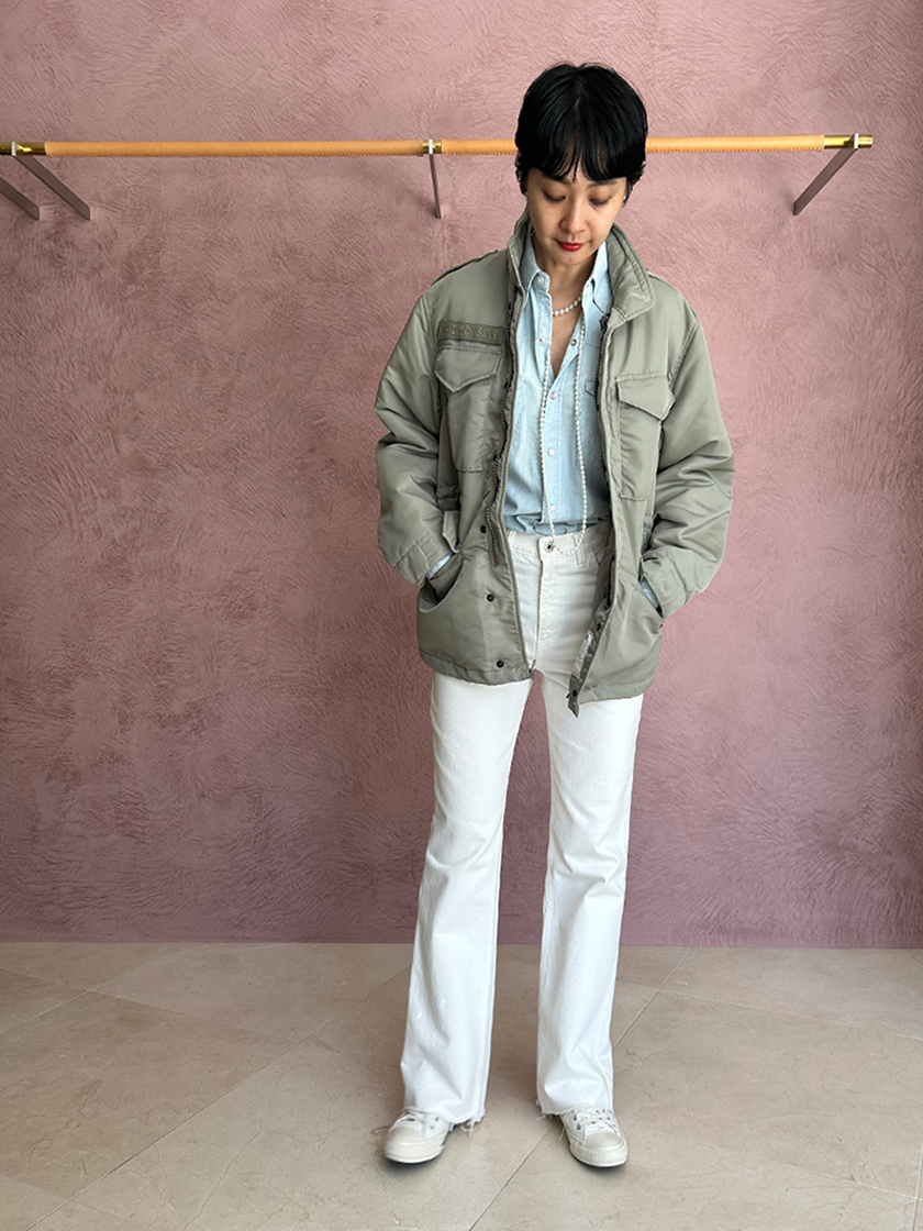 カーキのミリタリームードを軽やかに。アウターやレイヤードを楽しみたくなる季節にぴったりの、ミリタリーテイストのM-65ジャケット。程よくボリュームのあるシルエットで、ウエストのドローコードを絞れば女性らしいラインも演出可能。今季のシャンブレーシャツには、アクセサリーのようにきらめくピンクのスナップボタンをあしらって。そこにホワイトデニムを合わせることで、カーキの無骨さをマイルドに。首元はパールで仕上げれば、カジュアルながらも凛としたスタイルが完成します。冬へと向かう季節の変わり目には、あえて淡い色合いを選ぶことで、重くなりがちな装いに軽やかさと洗練された印象をもたらしてくれます。