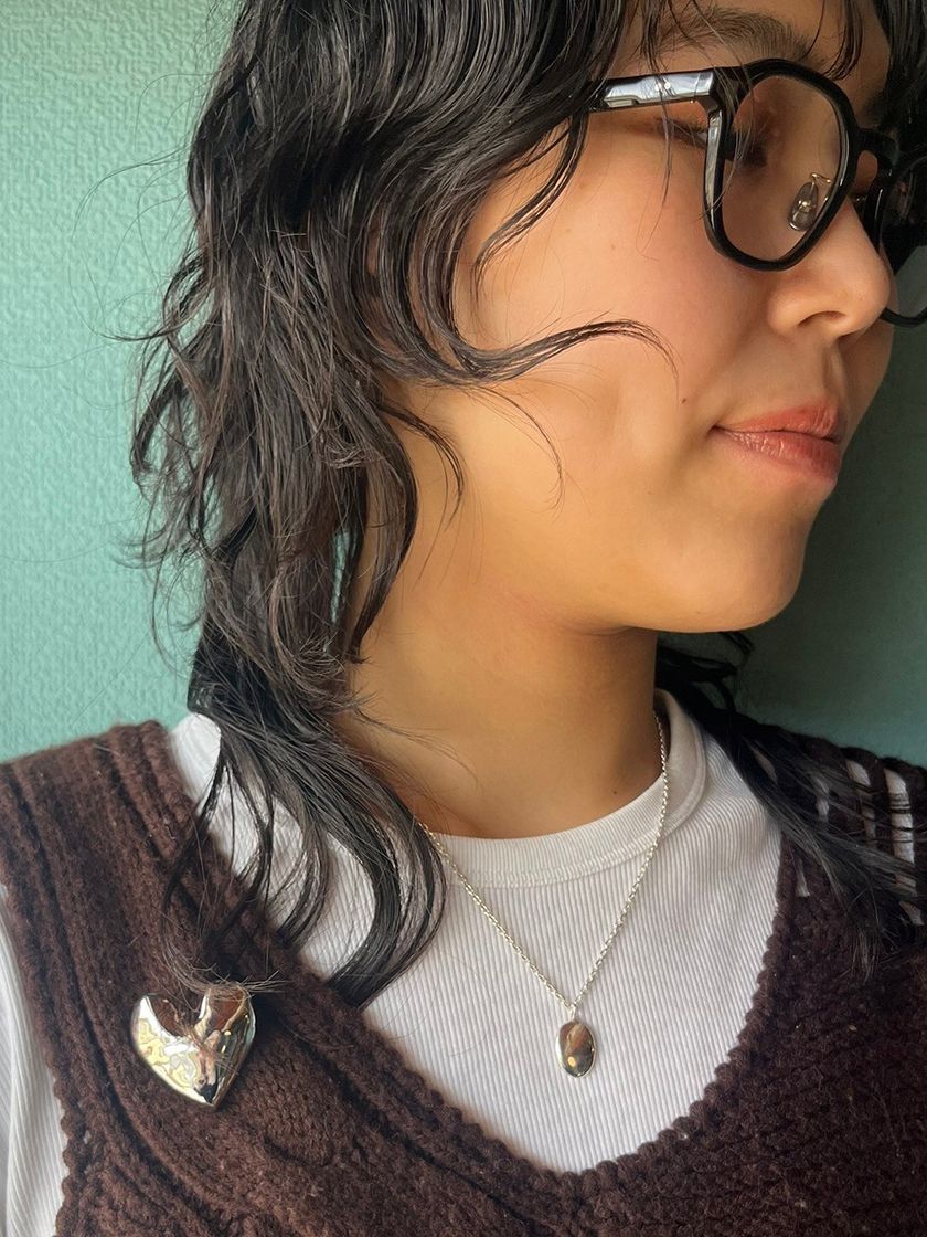 ぽってりとしたハートのブローチと、シンプルな楕円型ネックレスの組み合わせ。ブローチはゴールドとシルバーで異なる表情を楽しめ、ジャケットやニット、帽子、マフラーなど、さまざまなスタイリングに活躍します。楕円型ネックレスはデイリーに使いやすく、コーディネートの幅を広げてくれるアイテムです。