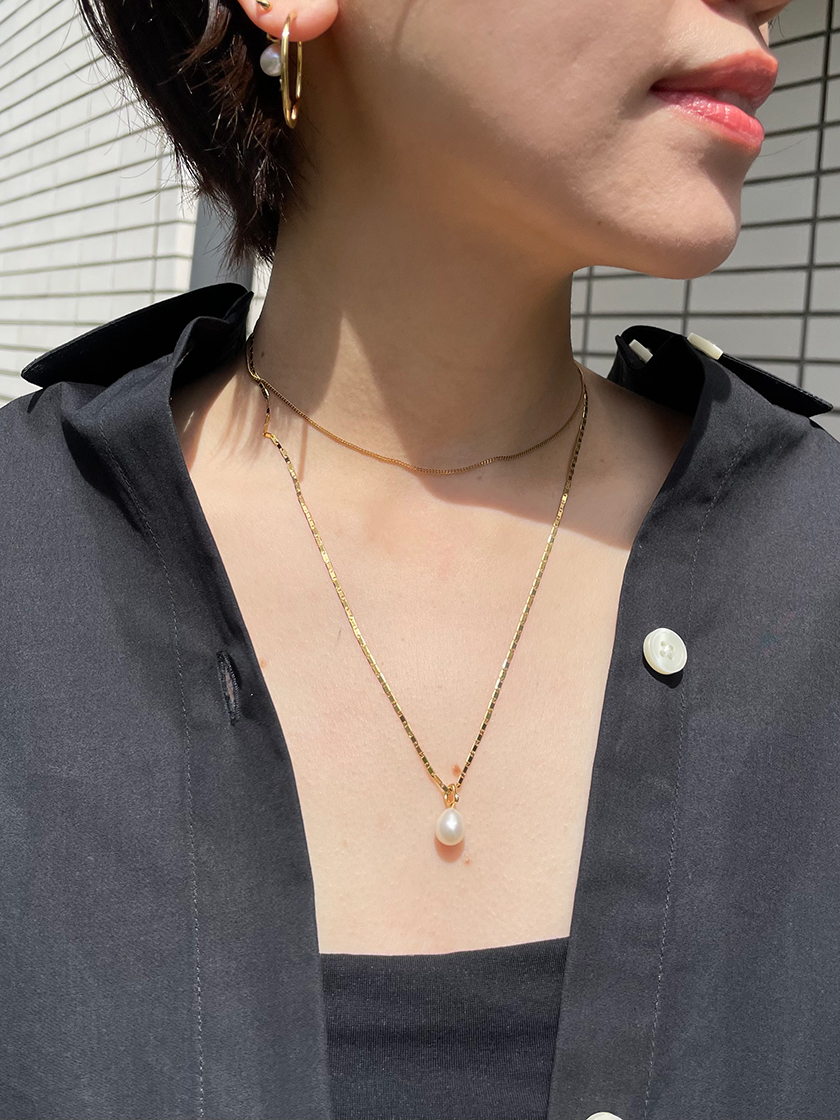 シンプルチェーンとパール付きのネックレスをレイヤード。スライダーボールが付いていて長さが自在に調整できるので、コーディネートの可能性を広げてくれます。それぞれ日常使いはもちろん、様々なシーンに役立つ万能なネックレスです。