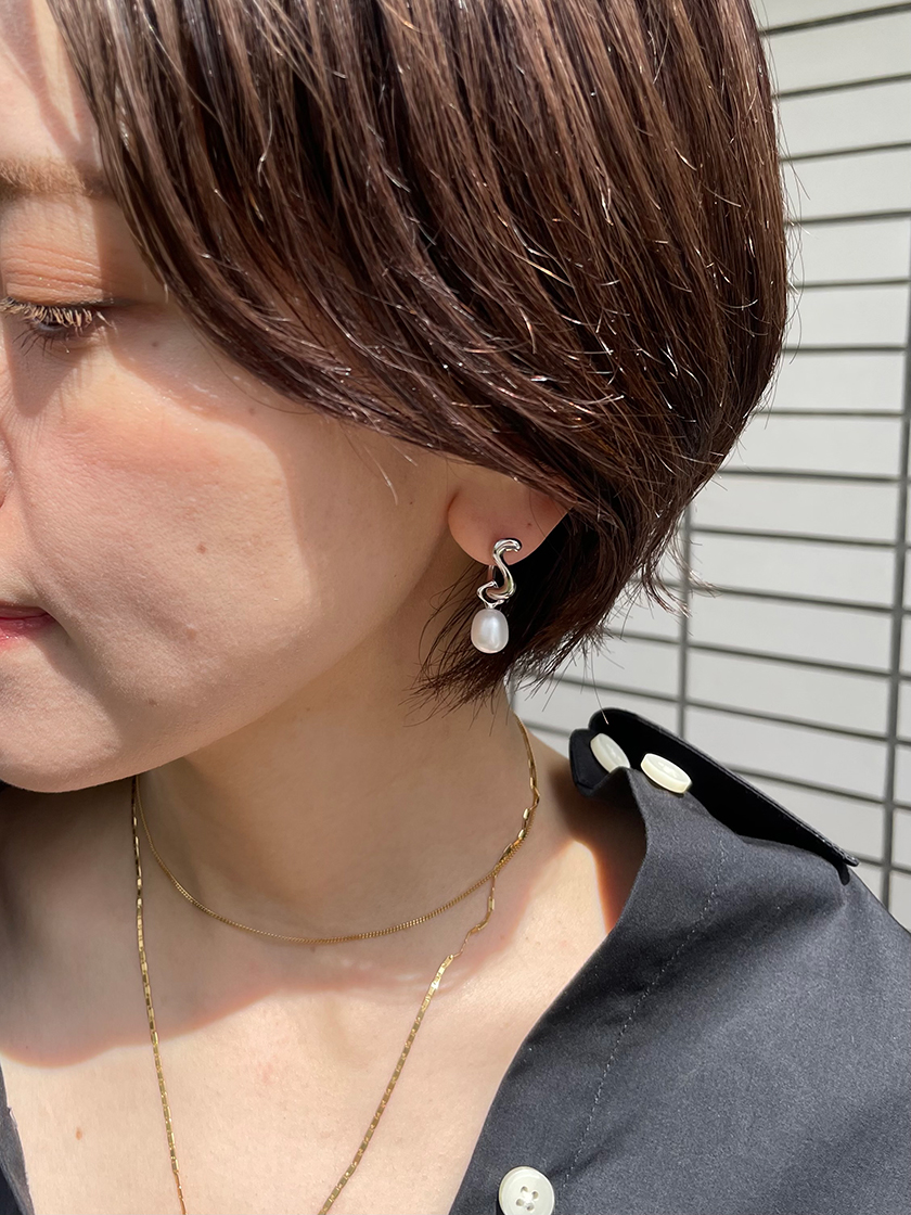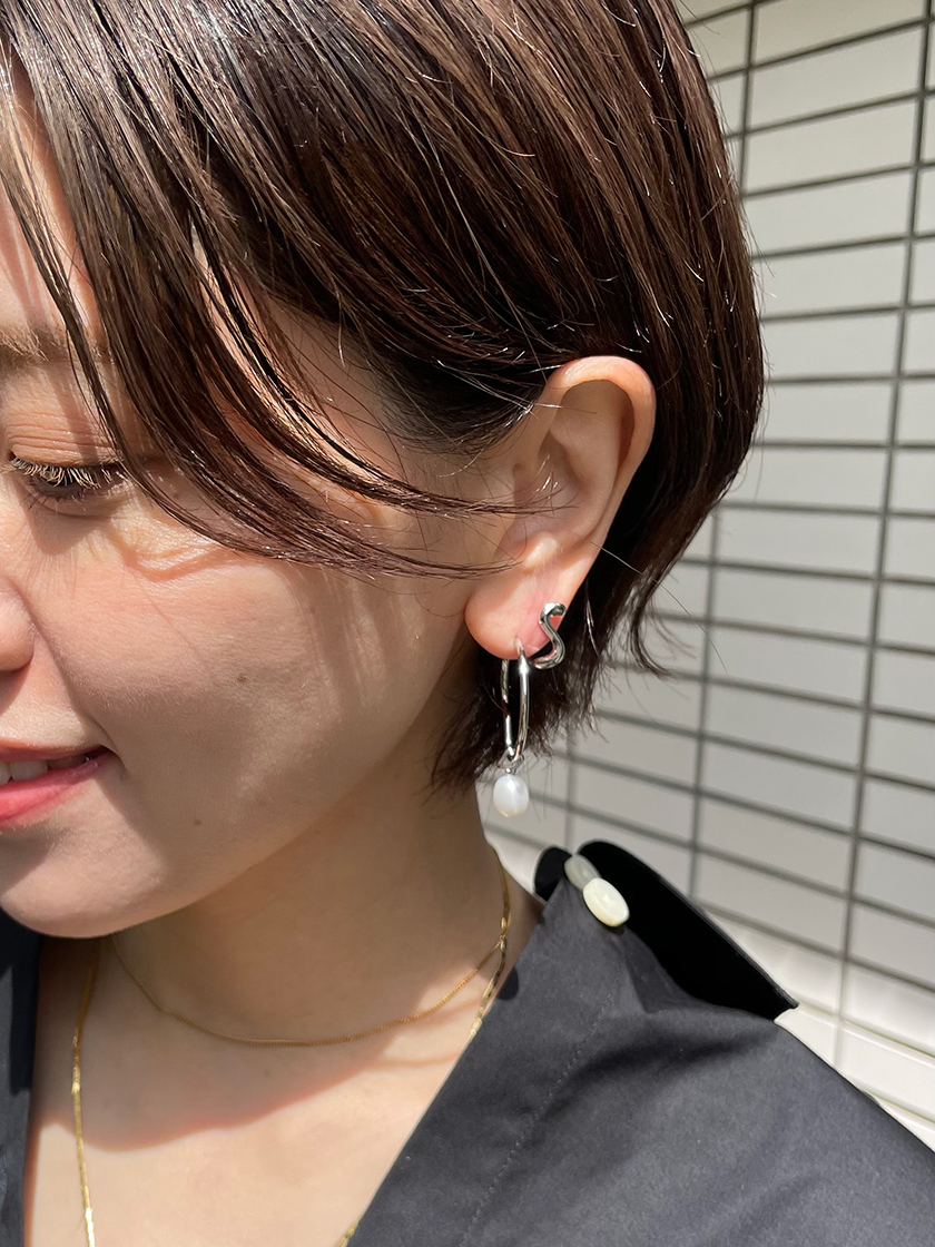 パール付きのシルバーハギーピアス。S字のようにカーブしたシルバーがユニークで、耳もとにさりげない個性をプラスしてくれます。パールは取り外しできるので、シンプルなハギーピアスとしても活躍。パールはネックレスや別のピアスチャームとしても使用できるので、このピアス一つで色んなアレンジが楽しめます。