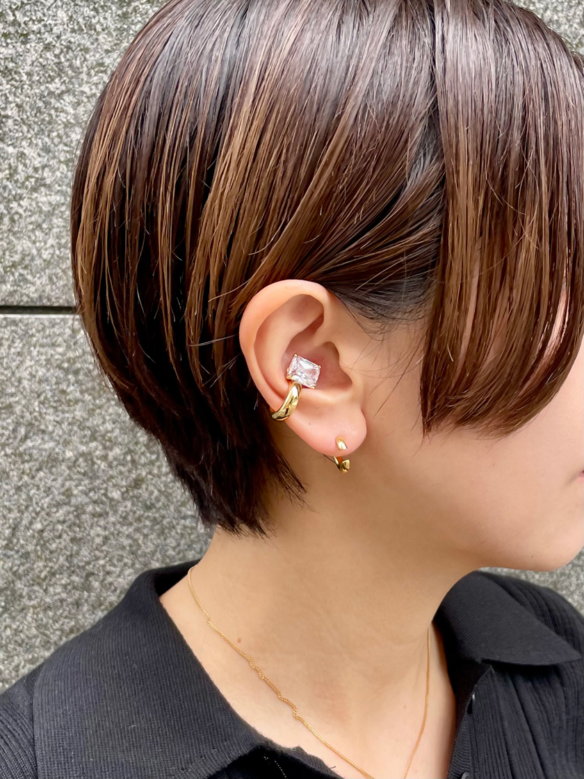 六本木のネオンやシャンデリアの輝きをデザインに取り入れたイヤーカフとネックレス。スクエアのジルコニアストーンが光を捉えてきらめき、顔まわりを華やかに彩ります。イヤーカフは耳の内側にストーンが入り込むデザインで、マスクをしても髪を耳にかけても邪魔になりません。