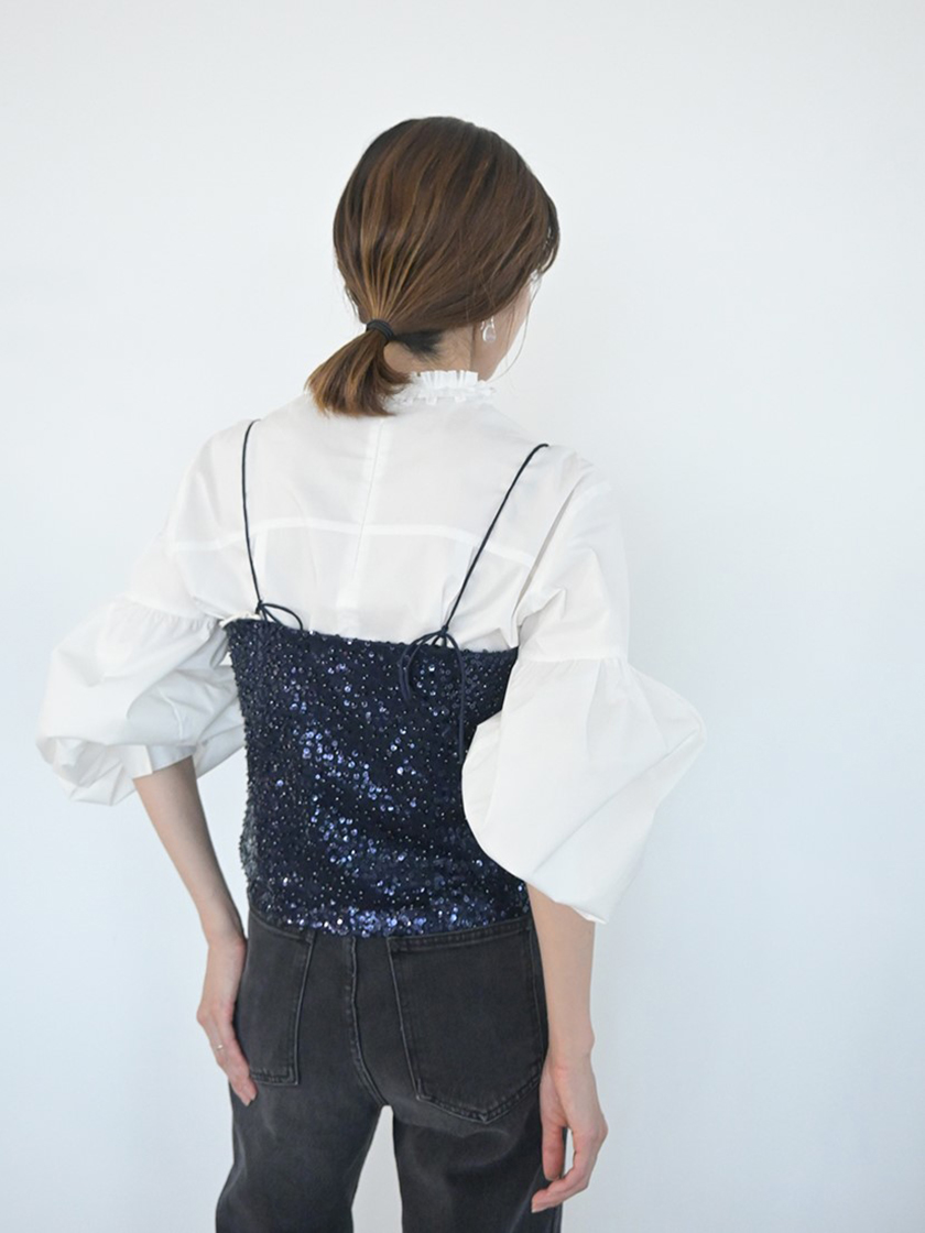 首元からフリルが覗く華やぎのあるデザイン。晩夏は一枚で、秋冬はベストやジャケットを合わせて首元からのぞくフリルがコーディネートのアクセントに。レイヤードしやすいようにシンプルな身頃にもこだわりました。タックとギャザーの立体的なボリューム袖がモダンな印象で、オフィシャルからプライベートまで着まわしの効くアイテムです。
