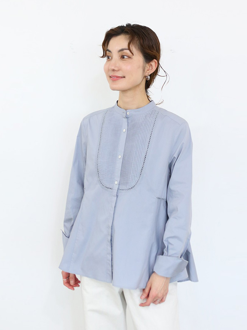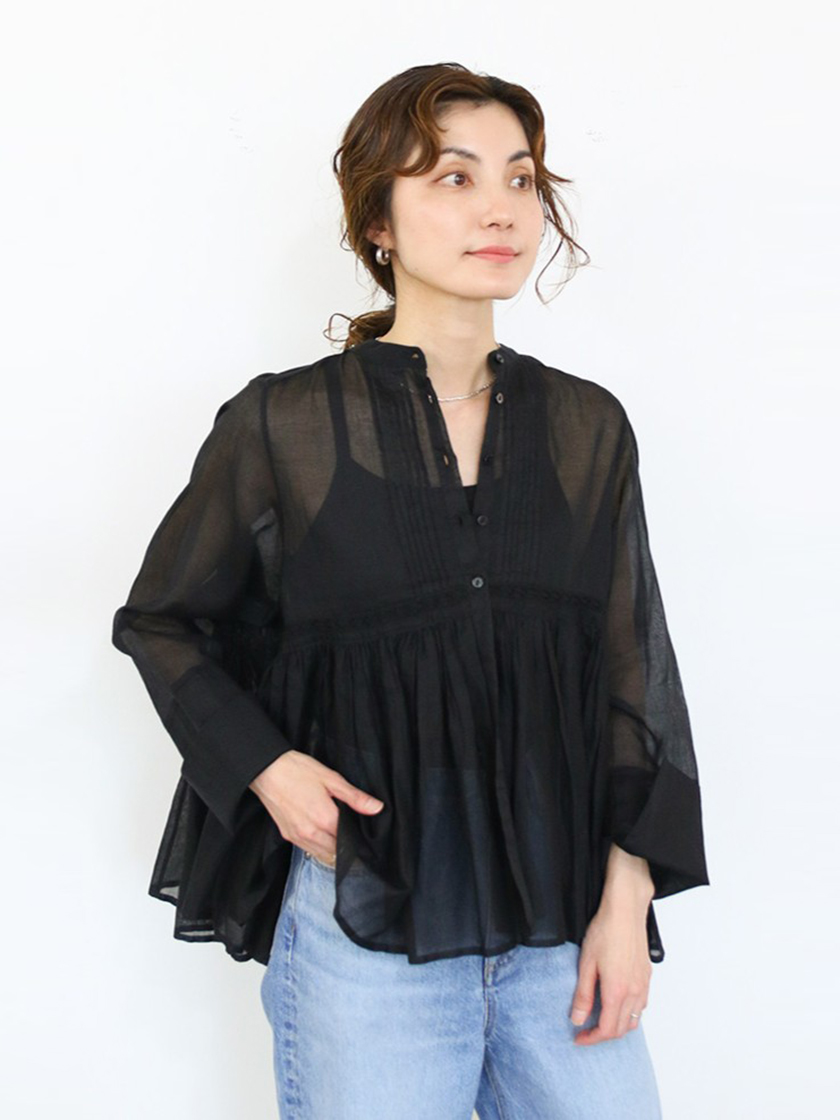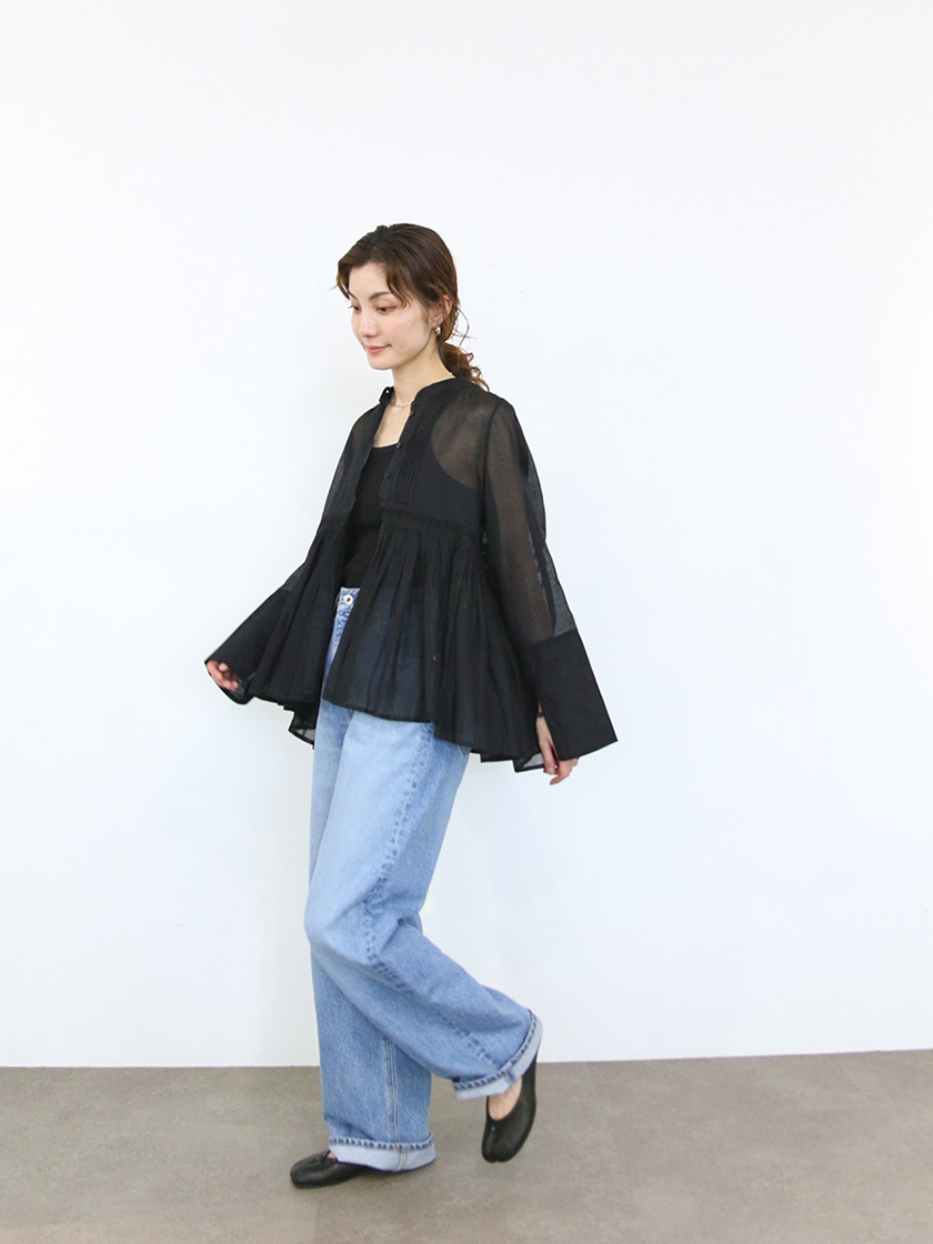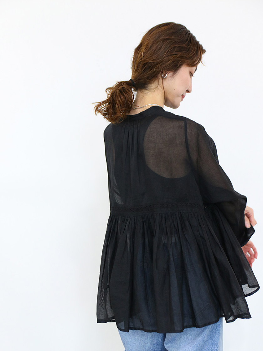 シアーなスターチドコットンで仕立てたフレアブラウス。タックやレース、立体的に広がるフレアラインが、インドならではのクラフト感を引き立てます。一枚で着るのはもちろん、軽く羽織るだけでも様になる万能デザイン。デニムと合わせて、抜け感のある大人のカジュアルスタイルに。晩夏まで長く活躍する一着です。