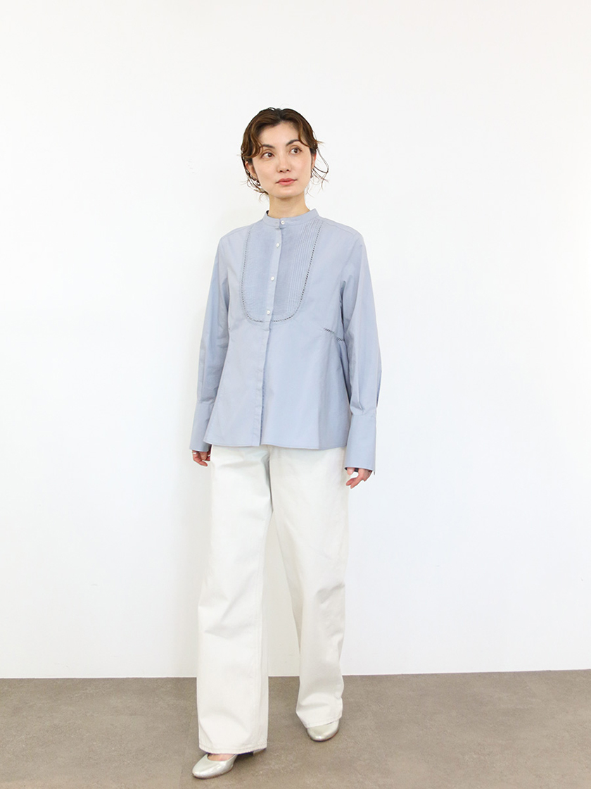 特殊ミシンによる刺しゅうが印象的な、「マリリンムーン」らしいブラウス。Aラインシルエットと長めのカフスが、さりげなくシャープなニュアンスをプラスします。軽やかな素材感とクリーンなカラーで、春の装いに華やぎを添えて。ボトム次第でオン・オフ問わず着回せる、頼れる一枚です。