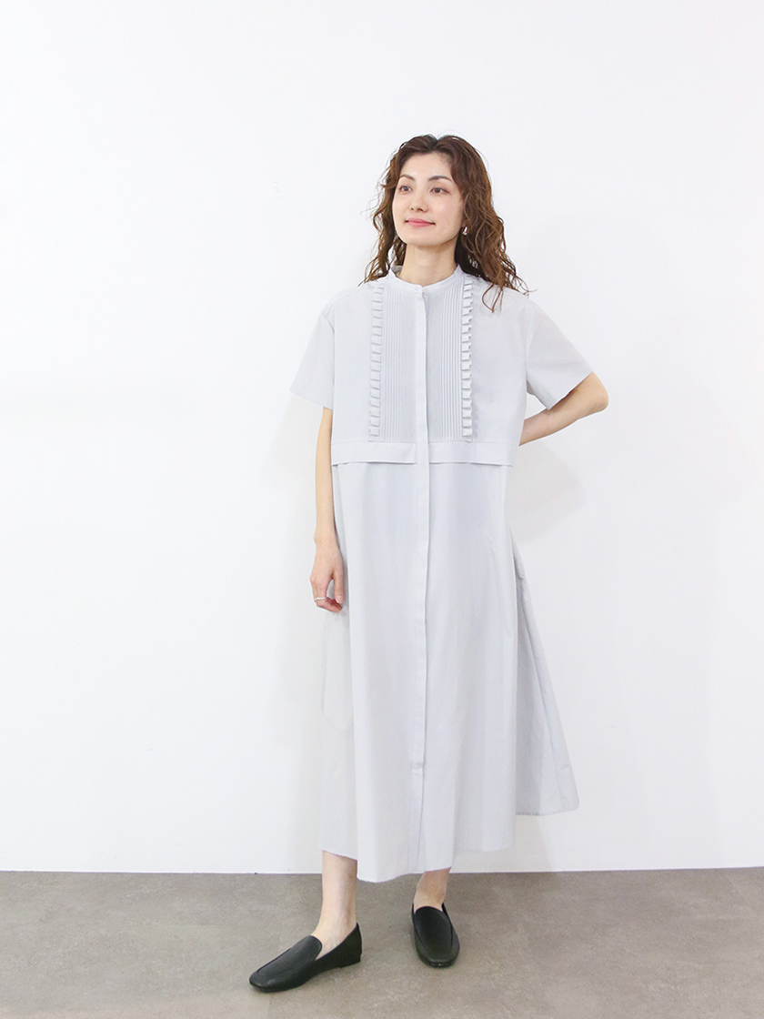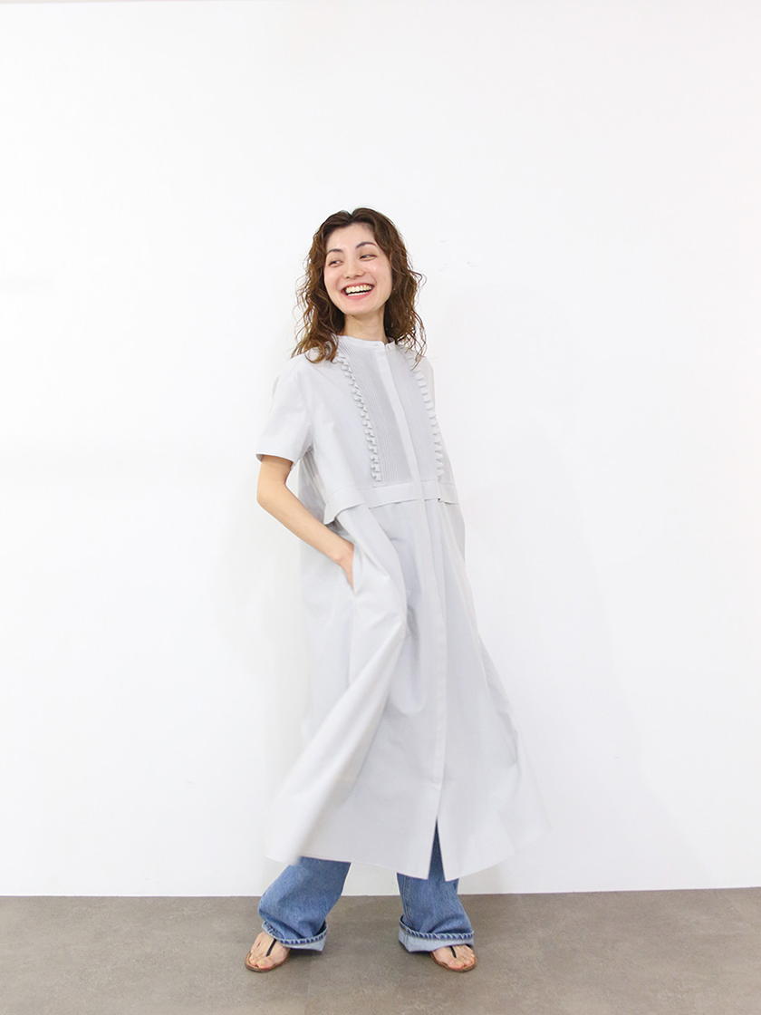 「マリリンムーン」で人気のシャツワンピース。繊細なピンタックやタック、タックフリルを贅沢にあしらい、一枚で着映えするデザインに仕上げました。高めのウエスト切り替えがスタイルアップを叶え、バランス良く着こなせるのも魅力。前を開けてパンツとレイヤードすれば、軽やかな羽織としても活躍。さらりと纏うだけで、洗練されたスタイルが完成します。