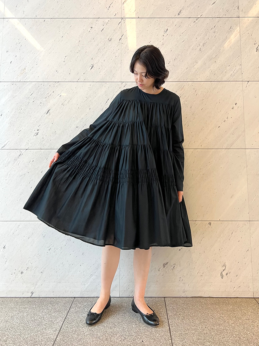 定番ティアードドレスをミディ丈で仕立てた“SOLIMAN MIDI/ソリマンミディ”。ふんわりと広がるAラインシルエットはそのままに、一枚着で普段使いしやすい着丈になりました。待望のブラックはオン・オフどちらも着まわせるカラー。ティアードのボリューム感をめいっぱい楽しめるよう、ドレスが主役の日はあえてブラックで統一します。