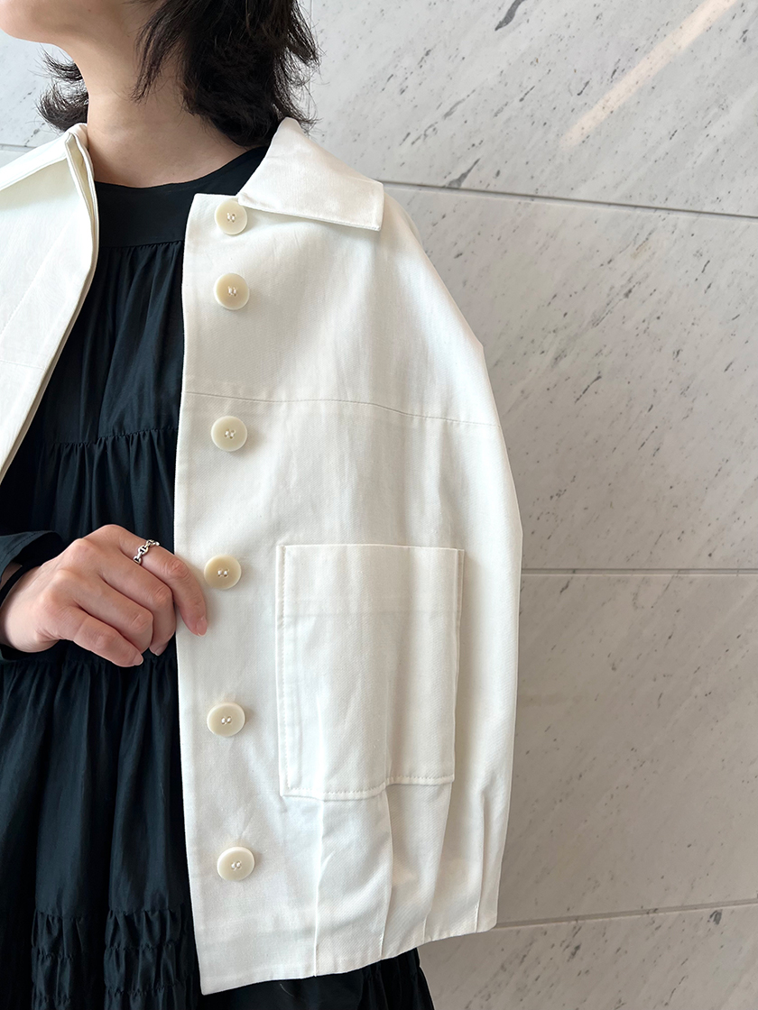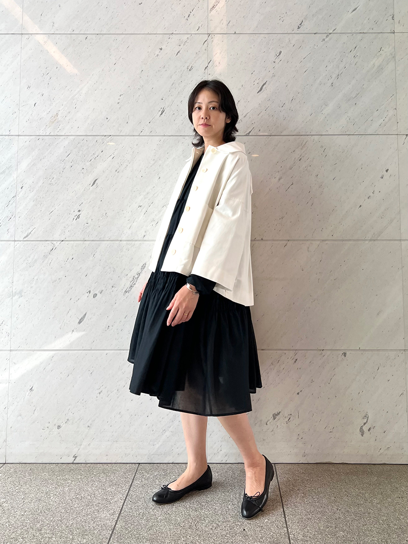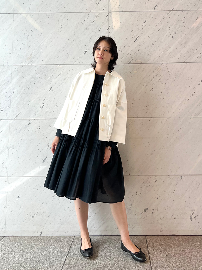 肌寒くなる頃には、「マーレット」のドレスにぴったりの新作ジャケットをオンする予定。少し短めの袖とバルーンのように膨らんだボディ、後ろ下がりのシルエットなど細部にこだわりの詰まった一着。特にお気に入りのポイントは、大きめのボタンとパッチポケット。さりげなく可愛らしさを感じるディテールがおしゃれゴコロをくすぐります。