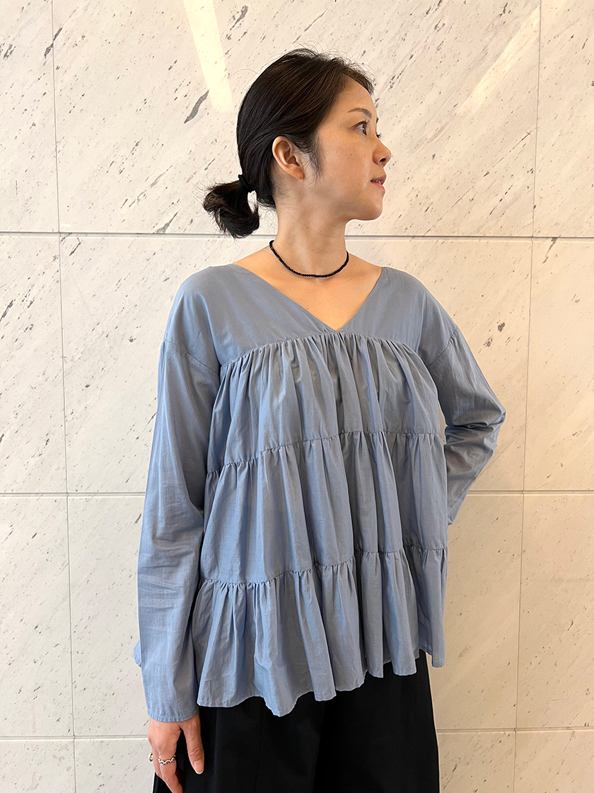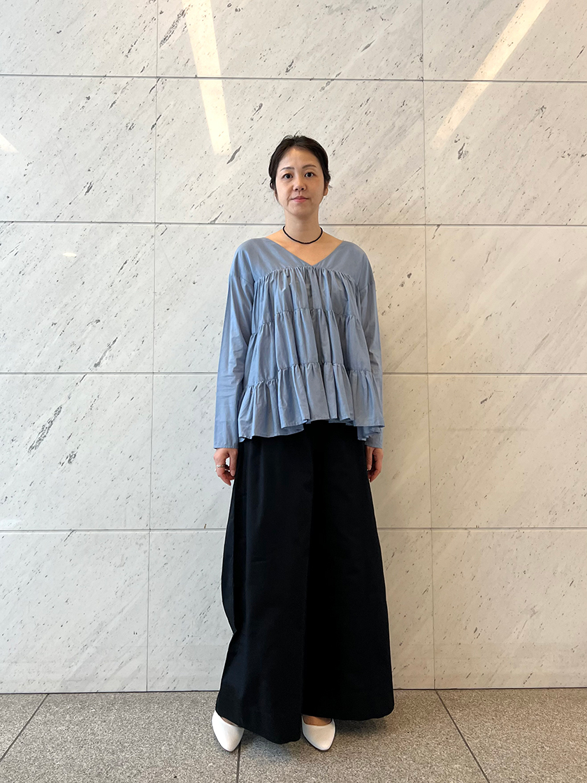 「マーレット」のティアードをドレスではなくブラウスで楽しめる“SIDONIA/シドニア”もいま気になる一着。ドレスと同じくらいにたっぷりと施されたティアードは、動くたびにエレガントな表情を浮かべます。首元は前後Vネックでデコルテやフェイスラインを美しく見せてくれます。ボトムはブラックのワイドパンツでモードなエッセンスをプラス。日々のコーディネートに華を添えてくれる、そんなブラウスです。