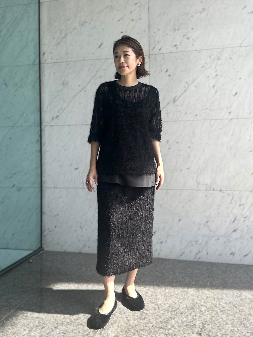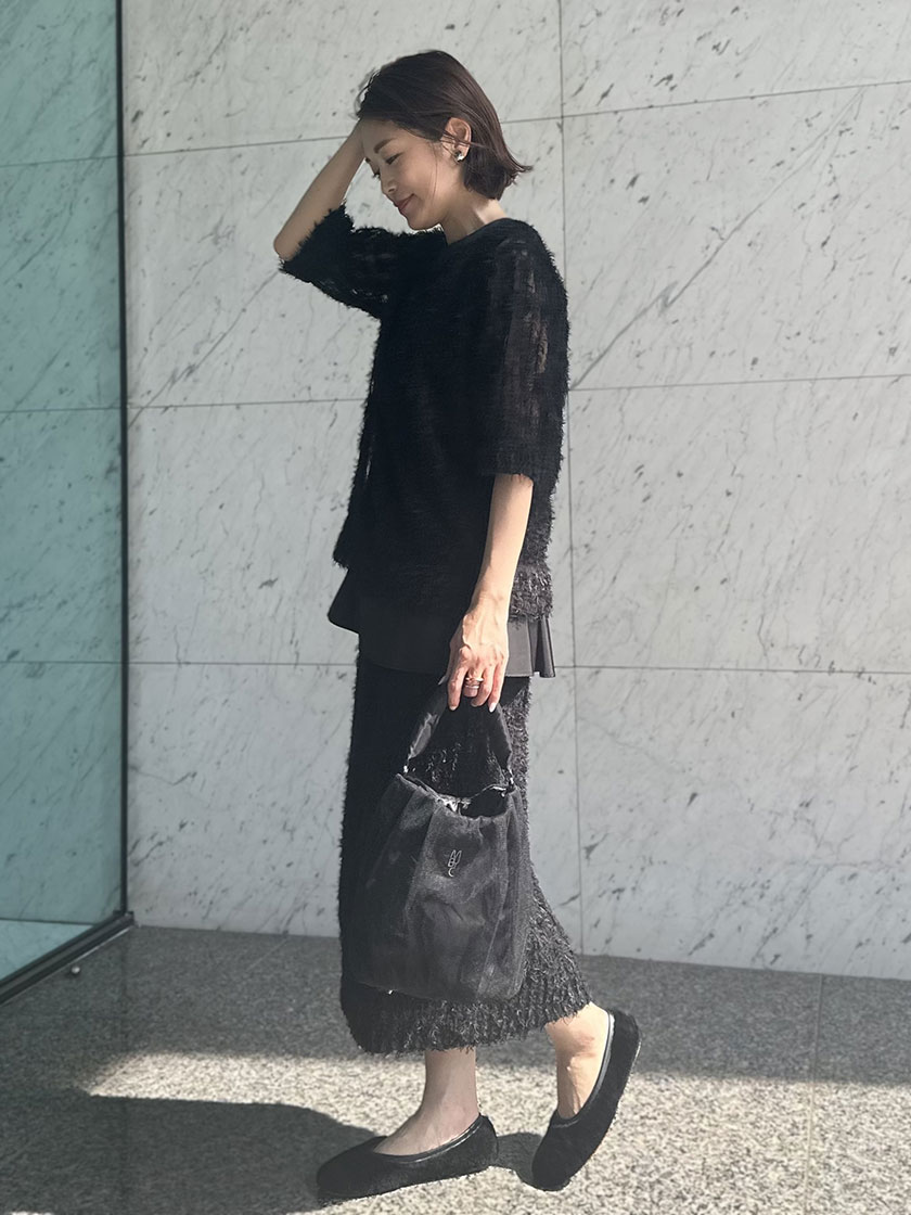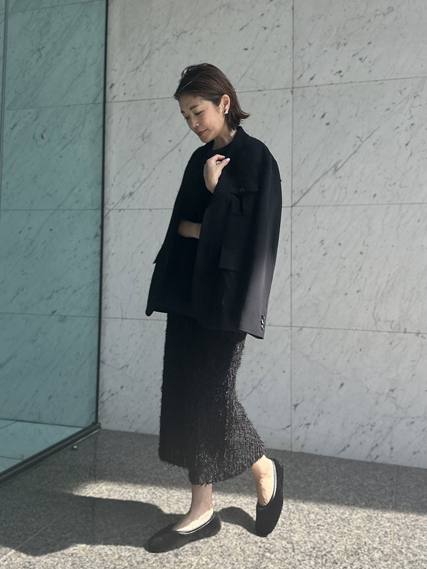 オールブラックながら、異なる素材を組み合わせて奥行きのあるスタイリングにしてみました。