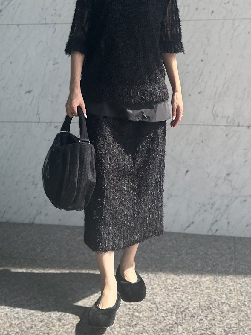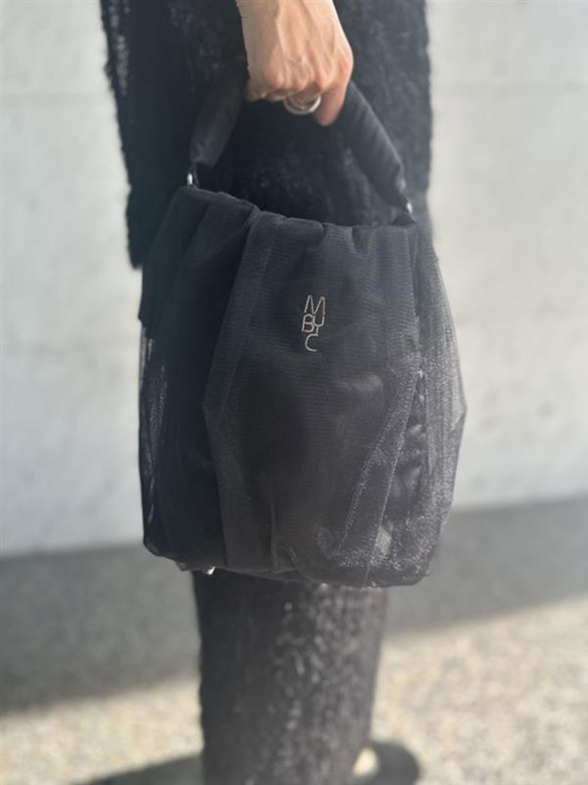 バッグはナイロンとチュールのレイヤードデザインがコーディネートにモード感を加え、良いアクセントに。ふんわりとした持ち手が柔らかさを添え、全体の印象を優しくまとめてくれます。