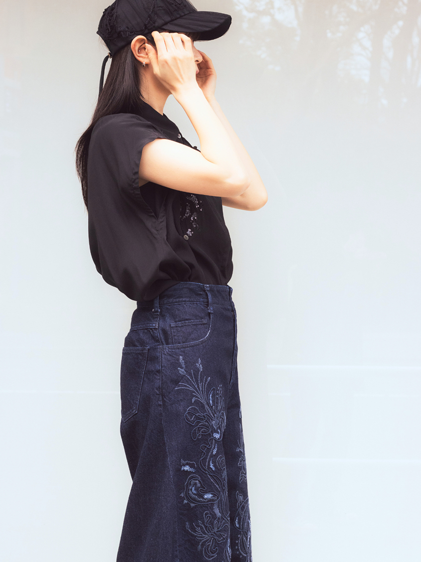 刺しゅうデニムを主役に、ミニマルなブラックシャツを合わせた洗練されたカジュアルスタイル。 トップスをタックインすることでシルエットの立体感を引き立て、刺しゅうの美しさを際立たせています。 キャップで程よく抜け感を加え、上品さの中にモードなエッセンスをプラス。
