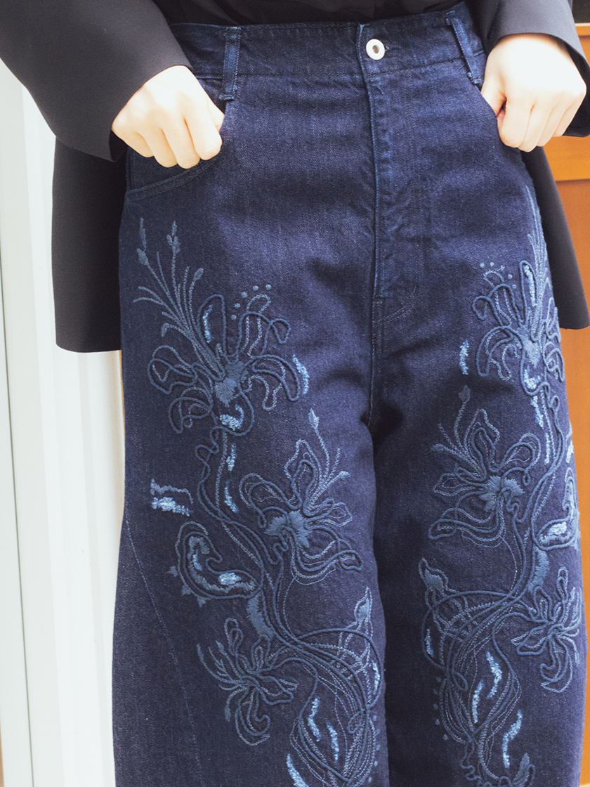 「ミューラル」 2026春夏コレクションから、ブランドを象徴する存在感を放つ刺しゅうデニムが登場。 児島の職人技によって仕上げられた刺しゅうは、デニムに自然に溶け込みながらも確かな存在感を放ちます。 印象的なデザインがスタイリングにアクセントを加え、カジュアルな中にも洗練された佇まいを叶える主役級の一本です。