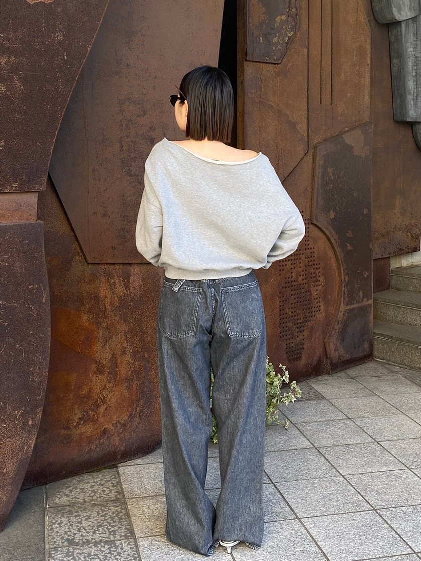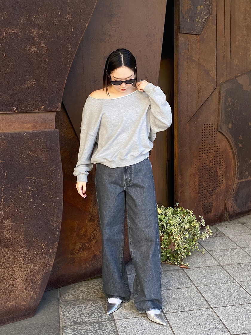 後ろのバックルでウエスト位置が調整可能な“KOH(コー)”。2wayでアレンジを楽しめるのが嬉しい一本です。ジャストサイズで履くよりも少しゆとりを持ったサイズ選びがおすすめ。デニムがカジュアルなシルエットなので、合わせるアイテムはオフショルのスウェットやヒール合わせでレディーにまとめました! 私が着用しているカラーは“SHONAN DK GRAY”で、ブルー系の“SHONAN MD BLUE”もご用意しています。着こなしの参考にしてみてくださいね。