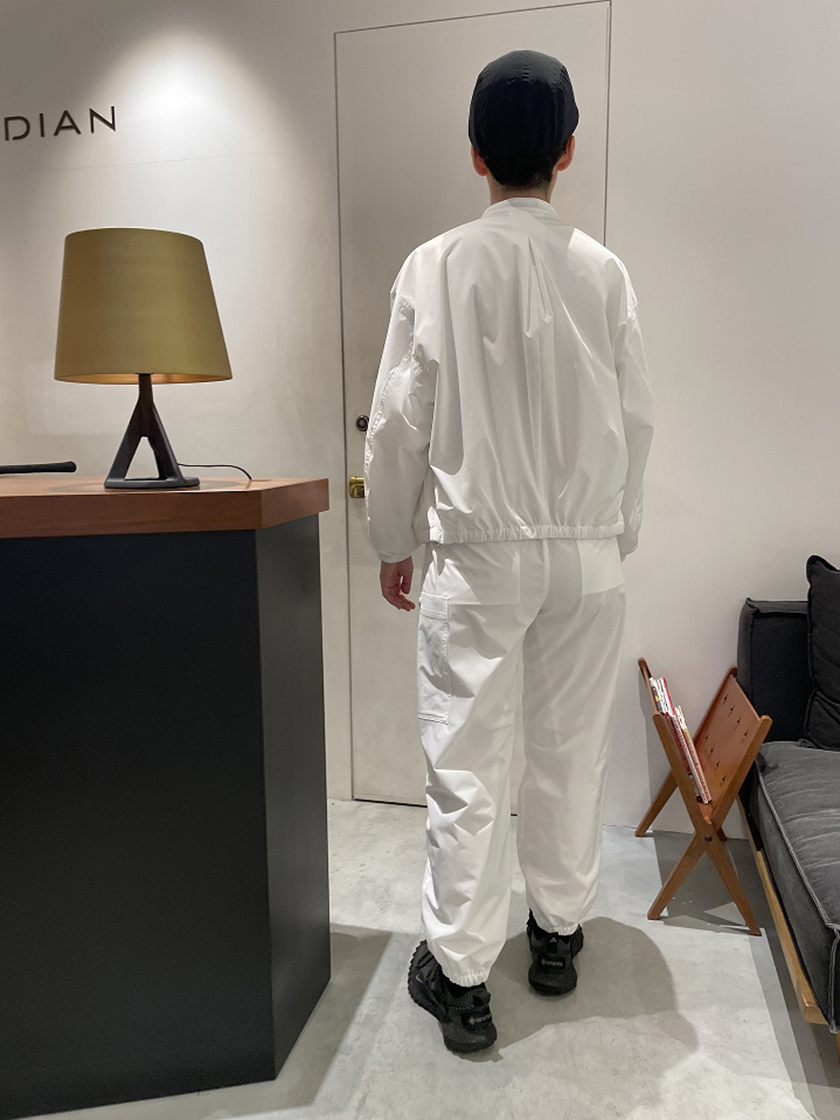 潔いホワイトのセットアップは春の風よけとして使え、撥水、透湿性に優れ、軽量で快適にプレーが可能。