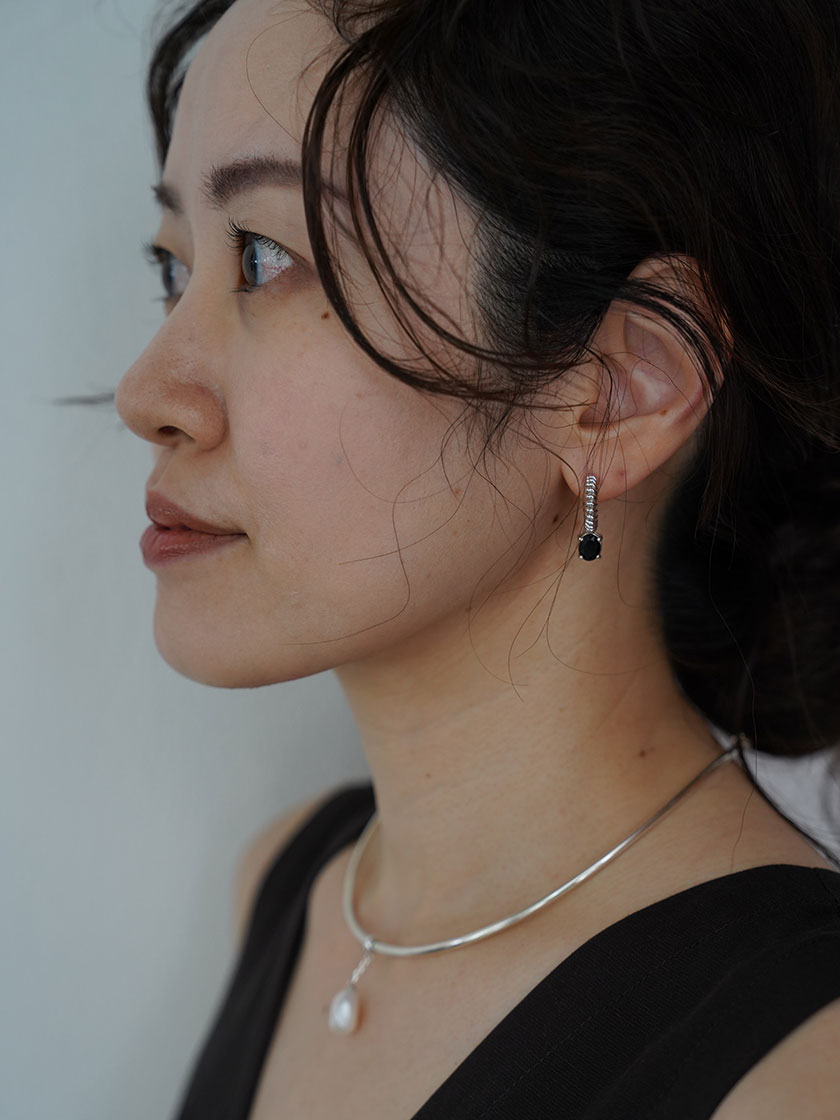 シンプルな夏コーデに映える、繊細なシルバーチョーカーと一粒パールのチャーム。上品さと抜け感を両立した首元に。揺れるブラックオニキスピアスは程よいボリューム感で、耳元にシックなアクセントを。動きのあるデザインが大人の余裕を演出します。