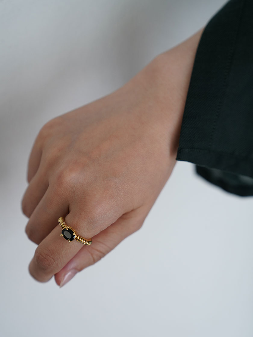 スプリング状の美しいフォルムが目を引く、手仕事仕上げのリング。中央のブラックオニキスが、凛とした女性らしさを引き立てます。単品ではもちろん、レイヤードでも映えるデザインで、夏の手元に奥行きをプラス。