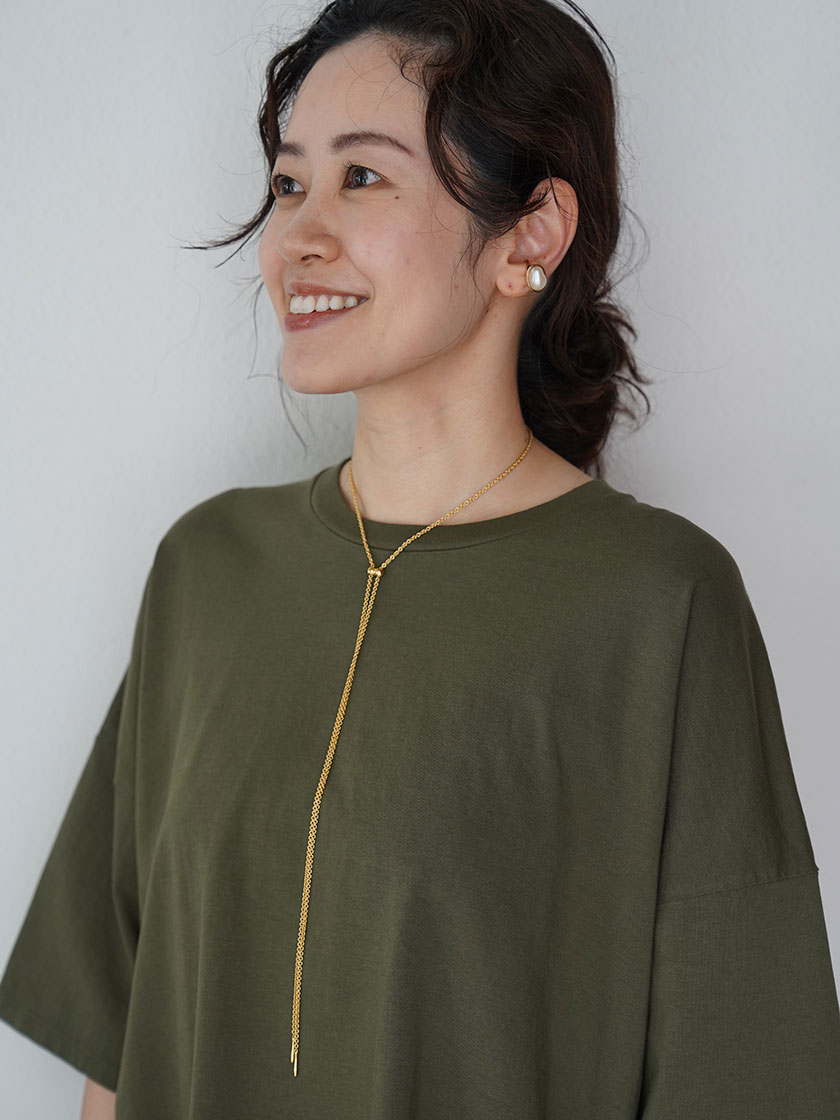 シンプルなTシャツに合わせても品よく映える、モダンなスライダーネックレス。ビーズをスライドして長さ調整でき、自在なアレンジが楽しめます。大ぶり淡水パールのイヤカフは、ひとつで印象的。ミニマルながら存在感があり、幅広いスタイルにマッチ!