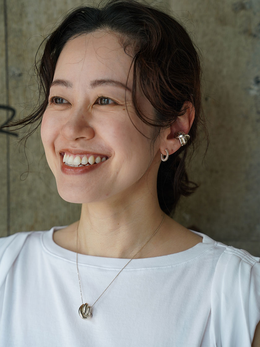 重厚感のあるシルバーネックレスは、夏のシンプルコーデにエッジをプラス。イヤリングはイヤカフとしても使え、ほどよいボリューム感で顔まわりにアクセントを。スプリング状のピアスはデイリーに使いやすく、装いを選ばず活躍します。