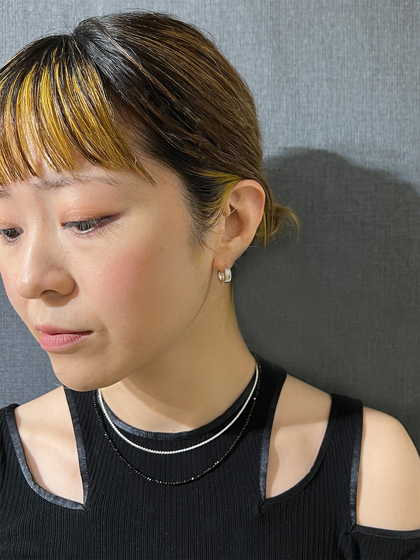 ブラックスピネルにはカッティングが施されていて、黒のお洋服に身に付けても同化せず美しい輝きを放ってくれます。シルバーとの相性もよく、少し長めのデザインなのでレイヤードスタイルにおすすめです。ネックレスで重ね付けを楽しんだら、耳元にはシンプルなフープピアスですっきりと。デイリー使いにも最適です。