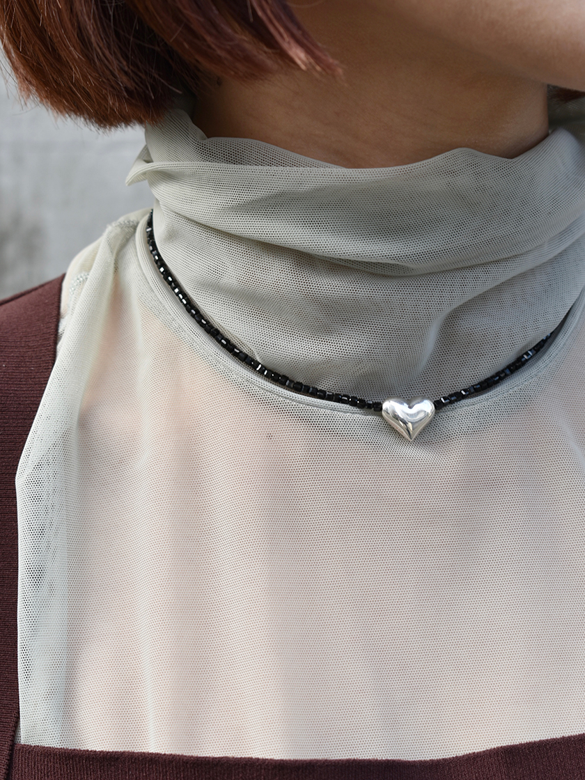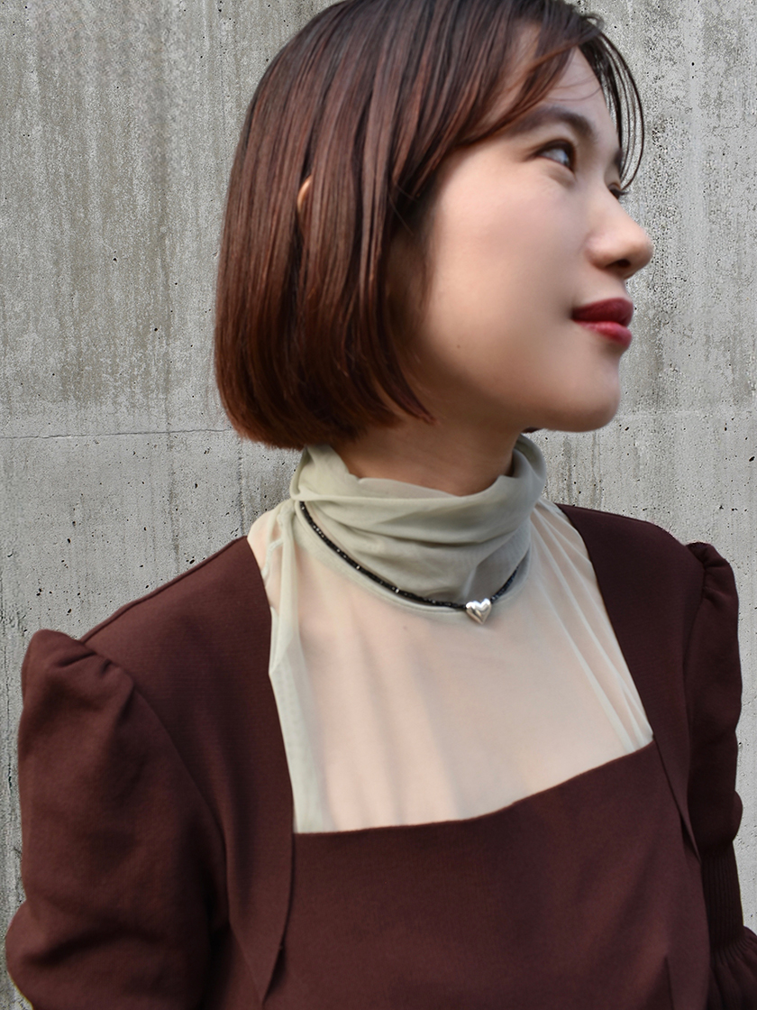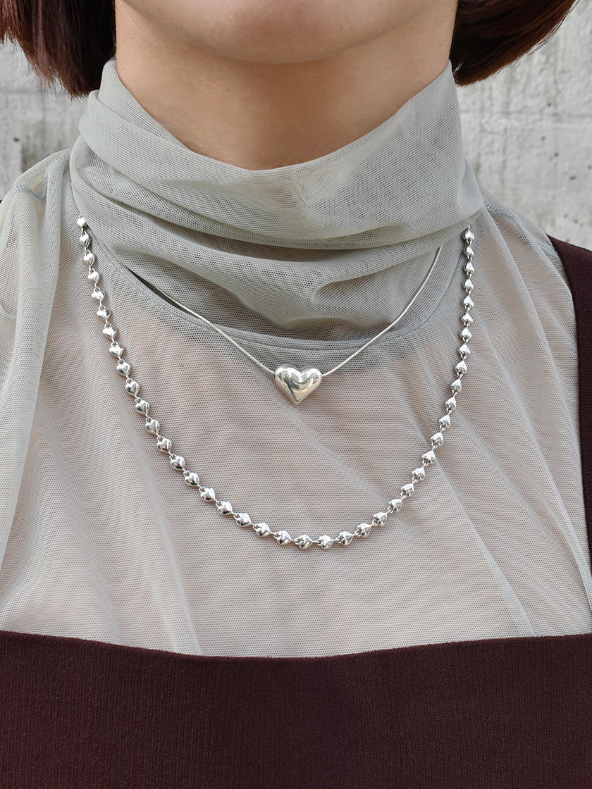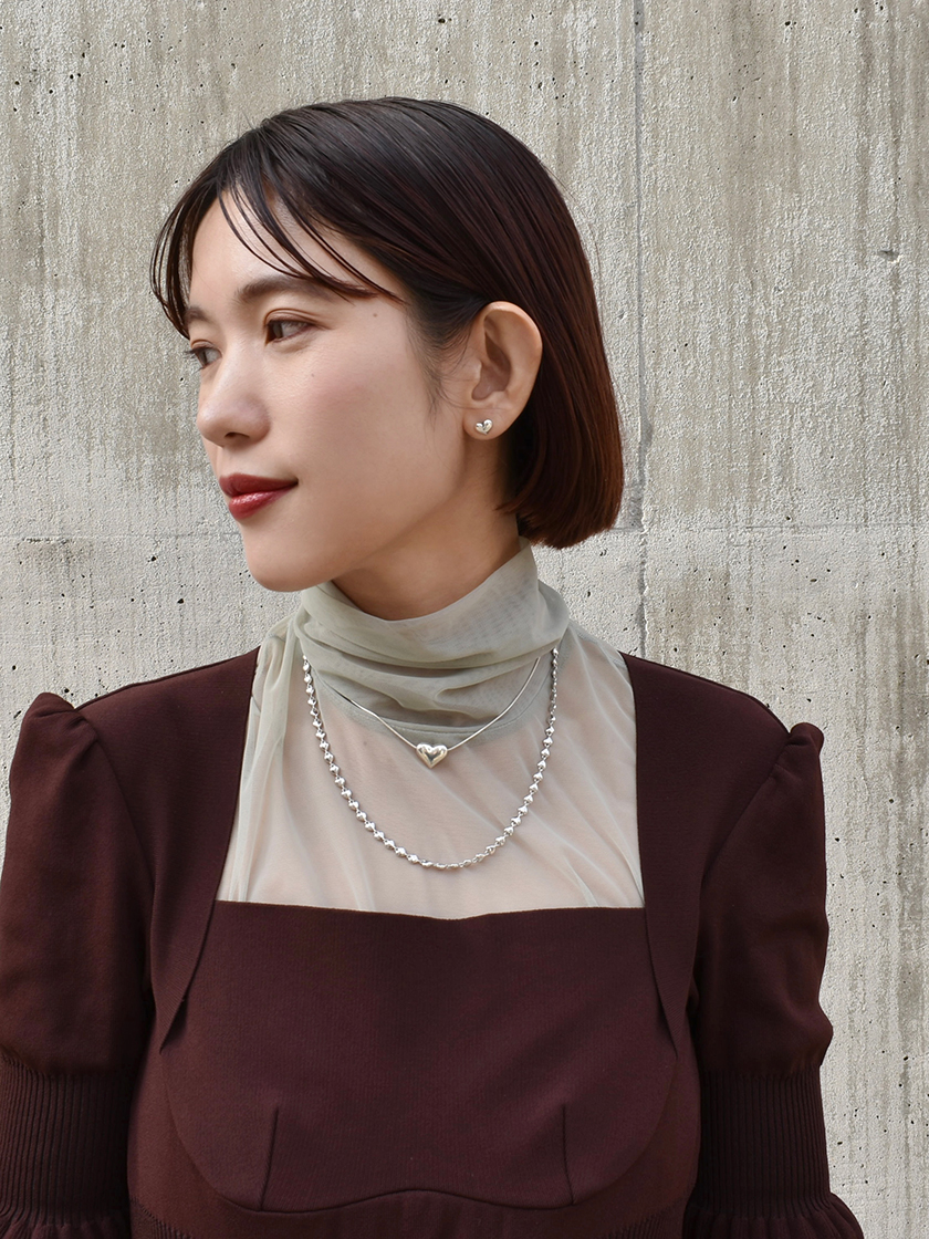 繊細なチェーンに柔らかな丸みを帯びたハートのネックレスとレイヤードしているのは、エッジの効いたハートシェイプのリズミカルなネックレス。ピアスもハートで合わせることで、首元の詰まったお洋服でも、洗練されたムードを引き出すお気に入りの組み合わせ。