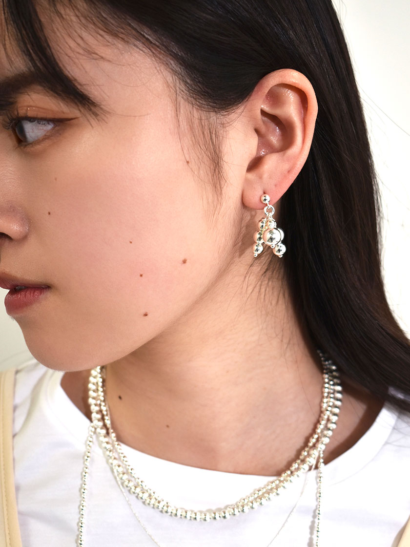 連なるシルバーボールと繊細なチェーンのレイヤードネックレスに、大小のシルバーボールがリズミカルに連なったモダンなネックレスを重ね付け。ラフな装いにさらりと纏えば、動くたびに繊細な輝きが存在感を放ち、スタイリッシュに引き立てます。耳元には、ユニークでモダンなデザインが際立つアシンメトリーピアスを。遊び心とエレガンスを兼ね備えたアイテムで、いつもと違うスタイリングを楽しんで。