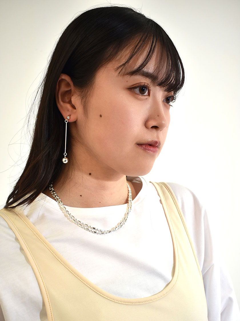 シルバーの煌めきがデコルテに美しく映える繊細なネックレス。ジェンダーレスな45㎝の長さは、レイヤードにも最適。ムード漂う繊細なアイテムには、ボリューム感のあるボールピアスをプラス。ボールを装飾したキャッチが、バックスタイルにもモードな雰囲気を演出します。